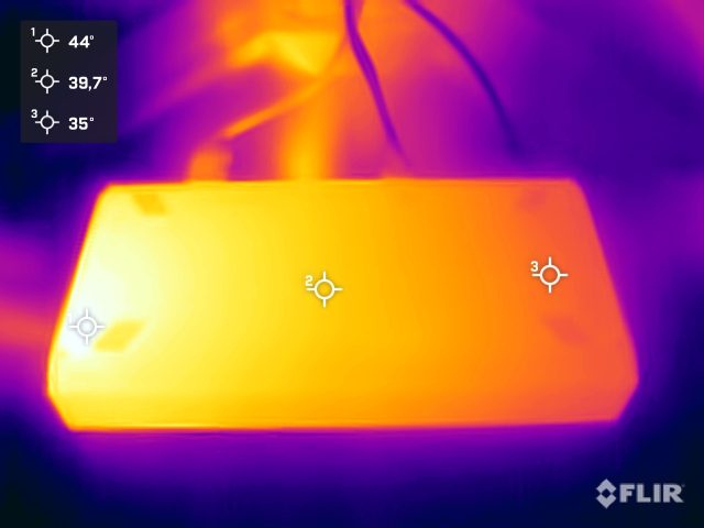 Metallhöljet blir ganska varmt under belastning och fördelar spillvärmen ganska bra över hela ytan. Undersidan värms upp lite mer än ovansidan. Vi kunde dock inte hitta några kritiska hotspots. Själva grafikchippet nådde 75 °C i stresstestet, vilket inte är en betydande förbättring jämfört med GPD G1. Under en kontinuerlig belastning på 120 watt kunde AMD Radeon RX 7600M XT:s fulla prestanda utnyttjas under en längre tid utan problem.