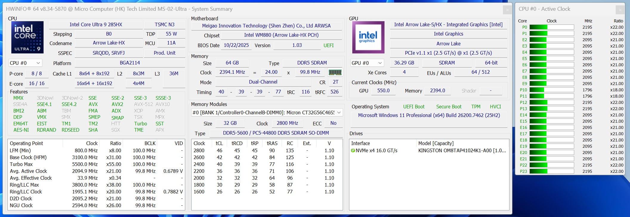| Minisforum MS-02 Ultra Intel Core Ultra 9 285HX ⎘ Intel Graphics 4-Core iGPU (Meteor / Arrow Lake) ⎘ 64 GB Minne, 1024 GB SSD | Amazon: 1. $1,499.90 MINISFORUM MS-02 Ultra Works... 2. $1,979.99 MINISFORUM MS-02 Ultra Works... 3. $3,749.99 MINISFORUM MS-02 Ultra Works... Listpris: 1279€ | 3.5 kg | 225 x 220 x 98 mm | |