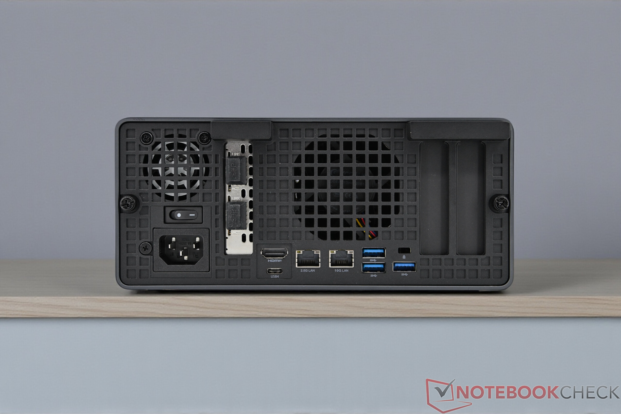 Minisforum MS-02 Ultra imponerar med ett högkvalitativt hölje som harmoniskt kombinerar metall och plast och ger ett professionellt intryck. Minidatorn är också extremt generöst utrustad när det gäller anslutningar: flera moderna höghastighetsportar, inklusive USB4 V2, säkerställer maximal flexibilitet för kringutrustning och externa tillägg. Nätverksutrustningen är särskilt anmärkningsvärd: förutom 2,5 Gigabit och 10 Gigabit LAN har systemet två SFP+-portar som möjliggör överföringshastigheter på upp till 25 GbE. Det kompakta systemet gör det också möjligt att installera ett dedikerat grafikkort i ett kompakt SFF-format.