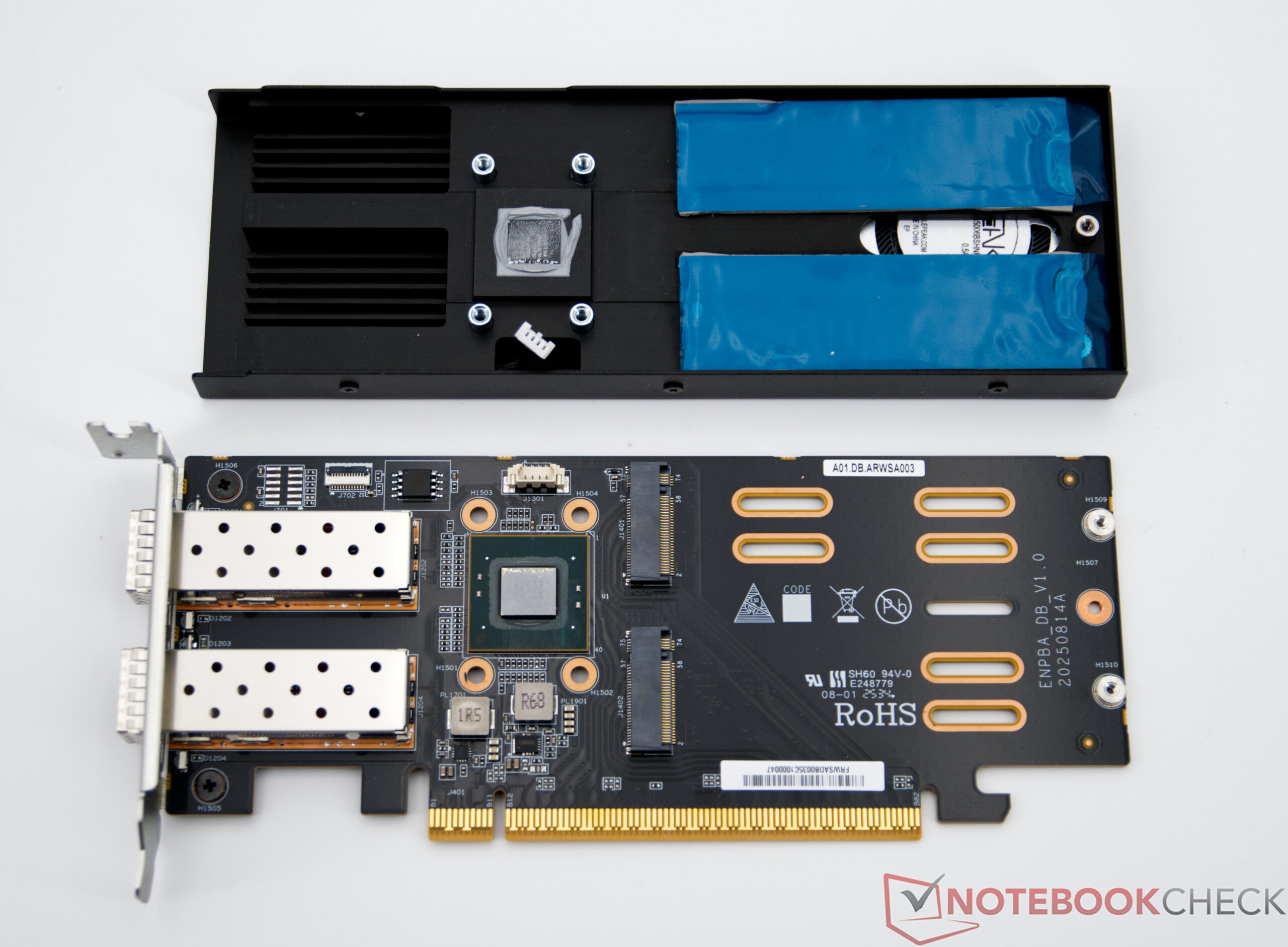 Tillbehören är få och inkluderar två kablar (IEC- och HDMI-anslutningskablar) samt ytterligare en passiv SSD-kylare i en särskilt platt design. Toppmodellen är också utrustad med ett PCIe-plugin-kort som ger plats för ytterligare två M.2 SSD-enheter utöver de två SFP+-portarna. Detta adapterkort ingår inte i Minisforum MS-02 Ultra med Intel Core Ultra 7 275HX CPU.