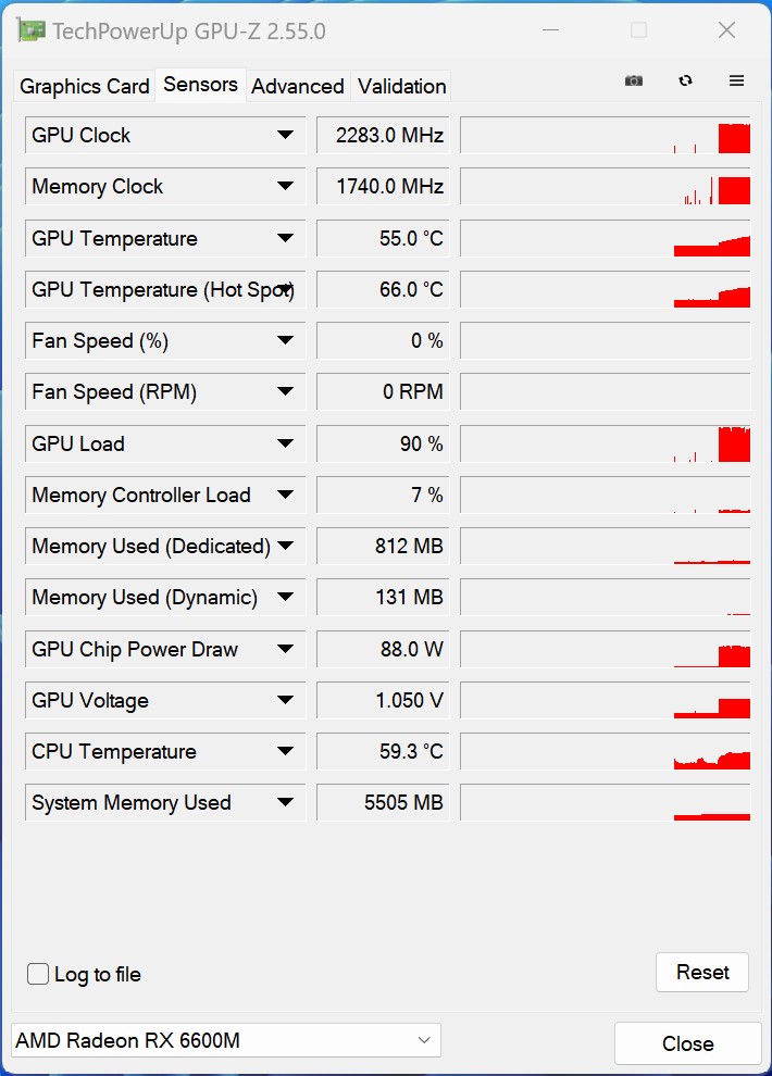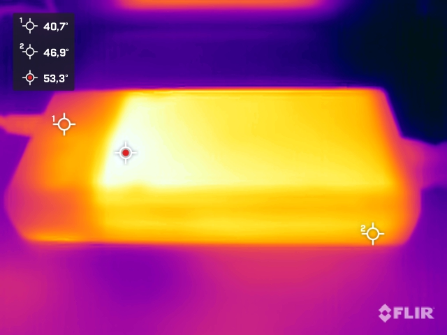 De temperaturer vi uppmätte visar ingen anledning till oro. Processorn når heller aldrig några kritiska temperaturer under belastning. Vi noterade endast 78,6 °C under stresstestet med Prime95. Grafikkortet uppvisar en liknande bild: Det nådde 86 °C under testet. När CPU och GPU belastas samtidigt når processorn en något högre temperatur på 89 °C. Vi noterade inte att Minisforum Neptune Series HX77G hade samma temperaturer för högspänningsomvandlare som vi uppmätte iAMD Radeon RX 6600M. Under stresstestet uppmätte vi endast 96 °C - en stor förbättring. Datorernas maximala prestanda (100 watt) kan användas till sin fulla fördel under en längre tidsperiod, vilket innebär att du inte behöver förvänta dig någon termisk strypning på enheten.