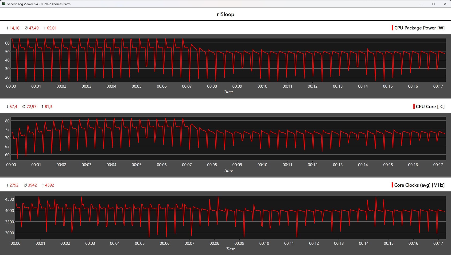 Under Cinebench R15:s kontinuerliga loop tar vi en titt på hur SoC:er beter sig under längre perioder av belastning. Minisforum Neptune Series HX77G klarade alla 50 körningar utan några större prestandaförluster. Trots detta sjönk CPU-prestandan något under den andra halvan av testet, men den stabiliserades sedan igen. Jämfört med konkurrenterna var detta tillräckligt för att vårt testexemplar skulle säkra sig andraplatsen.