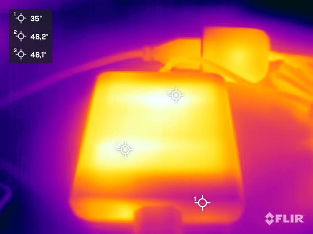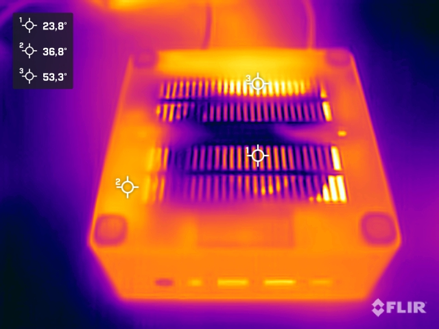 Processorn i sig nådde bara 78 °C under stresstestet - ett imponerande resultat. Datorns medeltemperatur på 71 °C är betydligt lägre och uppnåddes vid en kontinuerlig belastning på 45 watt. Med detta i åtanke kunde tillverkaren ha valt en något mer konservativ fläktkurva för att minska bullret en aning. Men Minisforum kunde också ha gett Intel Core i9-12900HK en högre effektgräns, eftersom kylenheten verkligen är kraftfull.