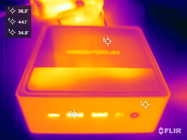 Minisforum Venus Series NAB9 är naturligtvis inte en av de tystaste enheterna. Trots detta går systemet relativt tyst och når endast 45 dB(A) under belastning. Dess genomsnittliga ljudnivå på 42,8 dB(A) är inte mycket tystare, och den når bara 27-33 dB(A) vid tomgångskörning. Datorn är inte vid något tillfälle helt tyst.