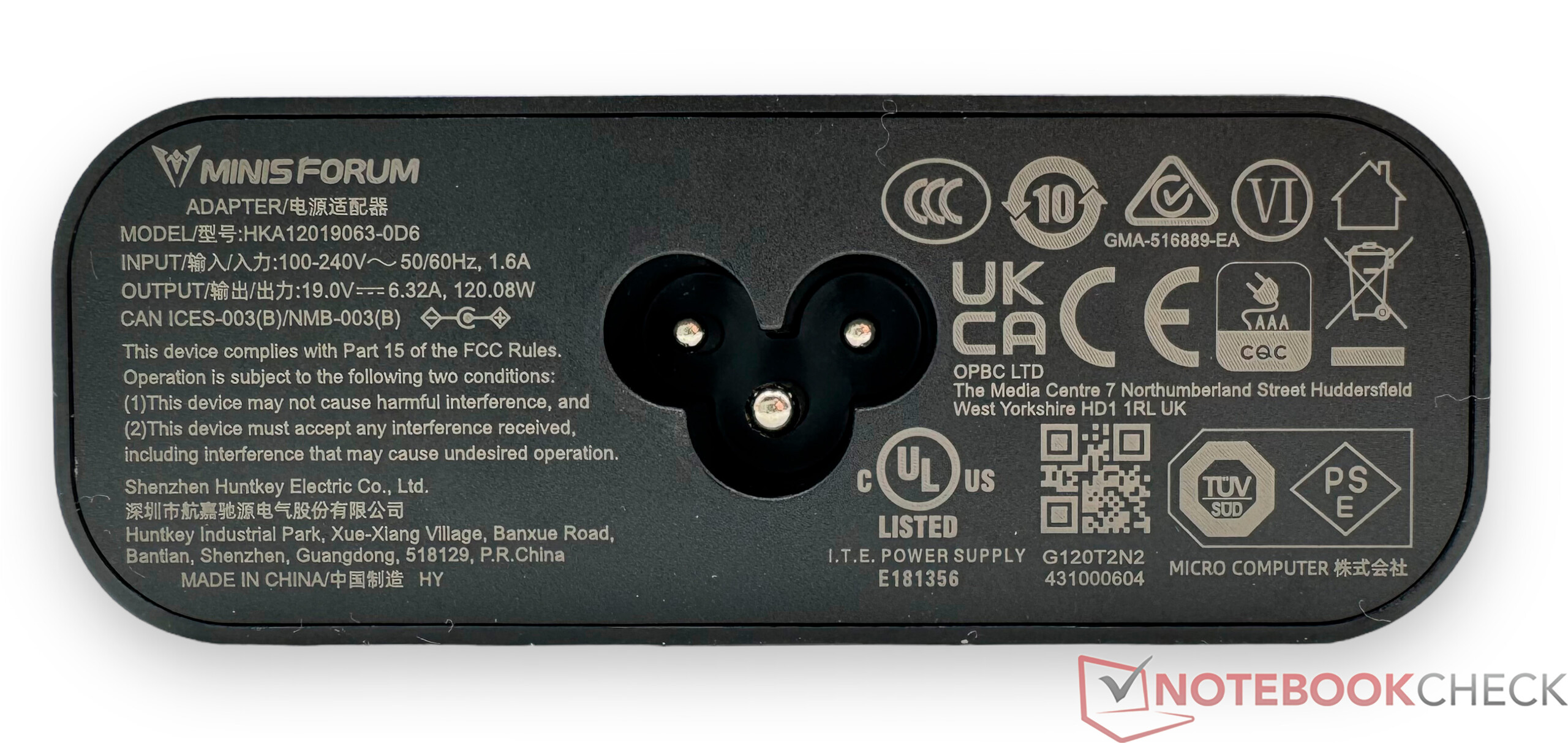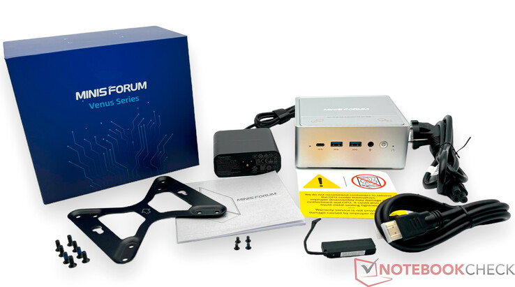 Tack vare sin kompakta storlek bör Minisforum Venus Series NAB9 inte ta upp för mycket utrymme på ditt skrivbord. Den har ett fotavtryck på endast 12,7 cm x 12,7 cm. Ändå är vårt testexemplar inte det mest kompakta i jämförelsefältet. Båda modellerna från Geekom (XT12 Pro, A7) är ännu mer kompakta. Minisforum Venus Series NAB9 kan också fästas på baksidan av en bildskärm med hjälp av det medföljande VESA-fästet. Själva enheten väger bara 615 gram och dess strömförsörjning lägger bara ytterligare 277 gram till din våg.