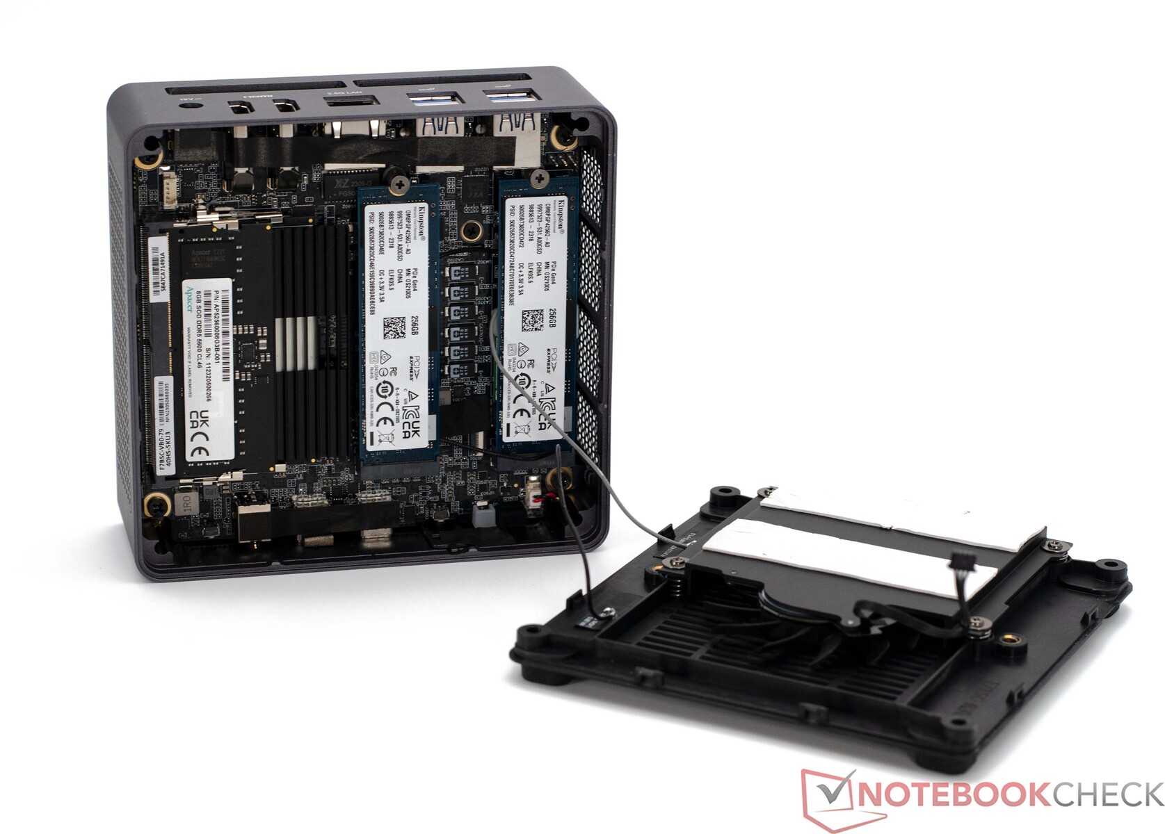 Minisforum Venus Series UM790 Pro kan öppnas på undersidan. Den nedre delen av chassit hålls fast av en massa små skruvar som sitter under gummifötterna. Man måste i princip slita av fötterna för att komma åt skruvarna, vilket inte är en särskilt bra lösning. Geekom har till exempel kommit på en mycket bättre lösning, nämligen att göra skruvarna till en del av själva fötterna. Datorn levereras åtminstone med två utbytesgummifötter - men i våra ögon är detta bara en nödlösning. Vårt testexemplar har inte något ledigt utrymme för expansion. Båda M.2-lagringsenheterna kan bytas ut och det kan även RAM-minnet och Wi-Fi-modulen, den senare är placerad under en av SSD-enheterna.