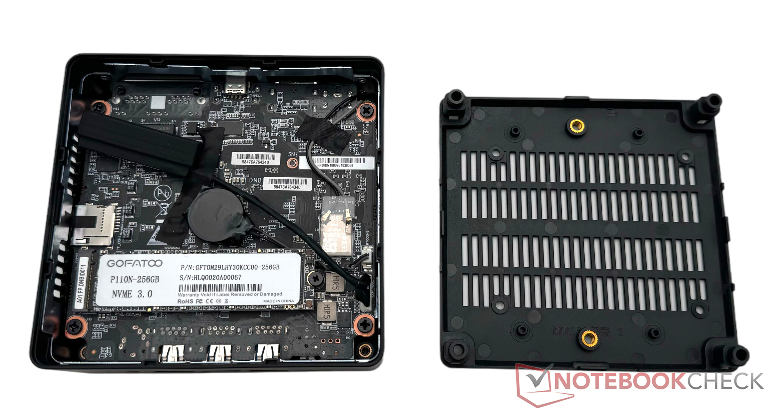 Underhållsarbete på Minisforum UM100D är endast möjligt i begränsad omfattning. RAM-minnet och den trådlösa modulen är fast installerade, och en M.2 SSD är redan förinstallerad i alla konfigurationer. Detta kan säkert bytas ut mot en modell med mer lagringsutrymme. Ändå kan en 2,5-tums lagring också rymmas i enheten. Enheten är relativt lätt att öppna från undersidan. De fyra skruvarna är dolda under gummifötterna, som endast är fixerade med små hakar och inte limmade på som ofta är fallet. CPU-fläkten är placerad på ovansidan, vilket innebär att hela kretskortet inklusive kylenheten måste tas bort om rengöring krävs. Med lite skicklighet kan detta göras enkelt.