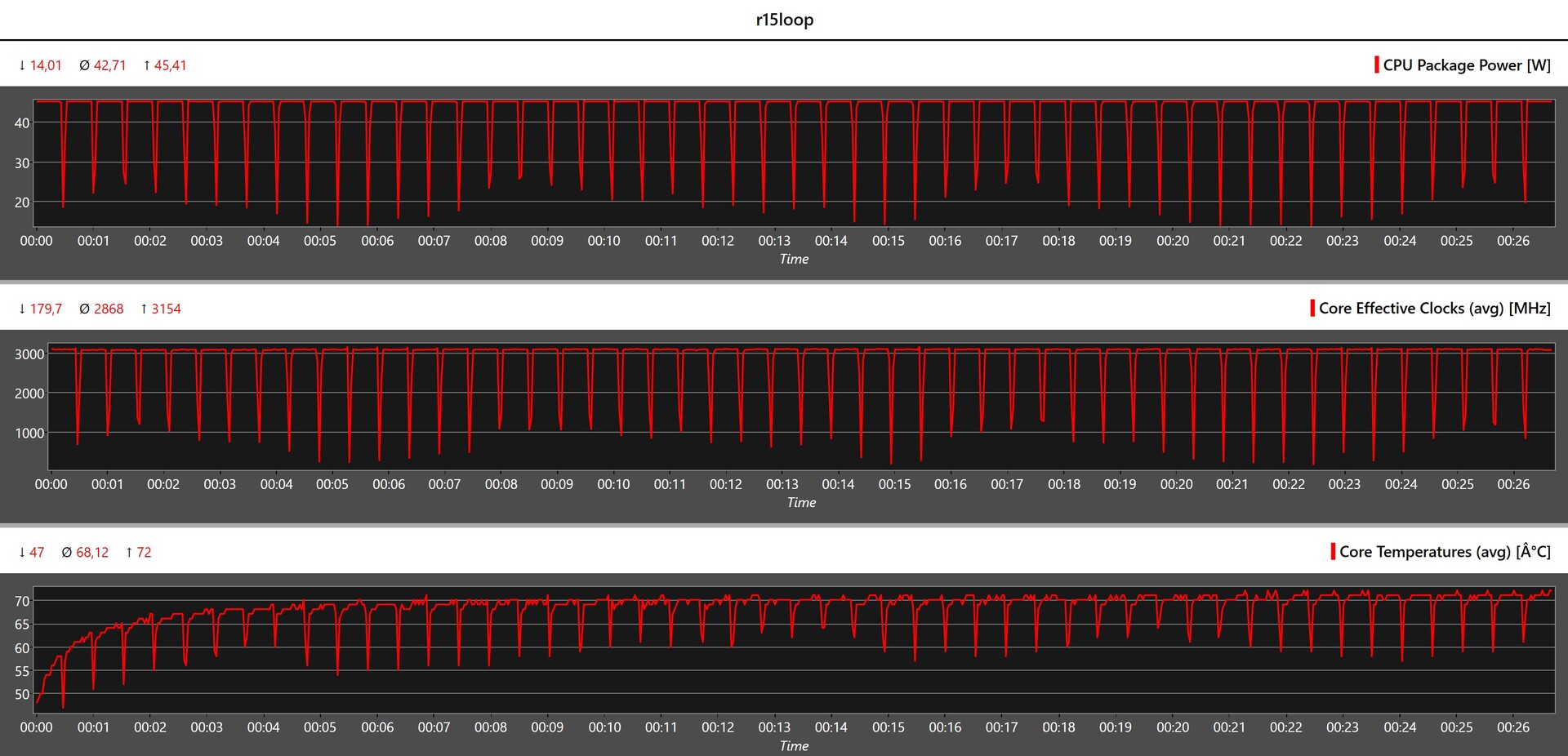 Under Cinebench R15:s kontinuerliga loop tog vi en titt på SoC:ns beteende över en längre tidsperiod. Minisforum Venus Series UN1245 slutförde alla 50 körningar utan att tappa prestanda. Här kan du tydligt se att Minisforum inte gerIntel Core i5-12450Hmer än 45 watt. Även när det gäller temperaturer kan du se att SoC bara värms upp gradvis och når ett maximum på bara 72 °C.