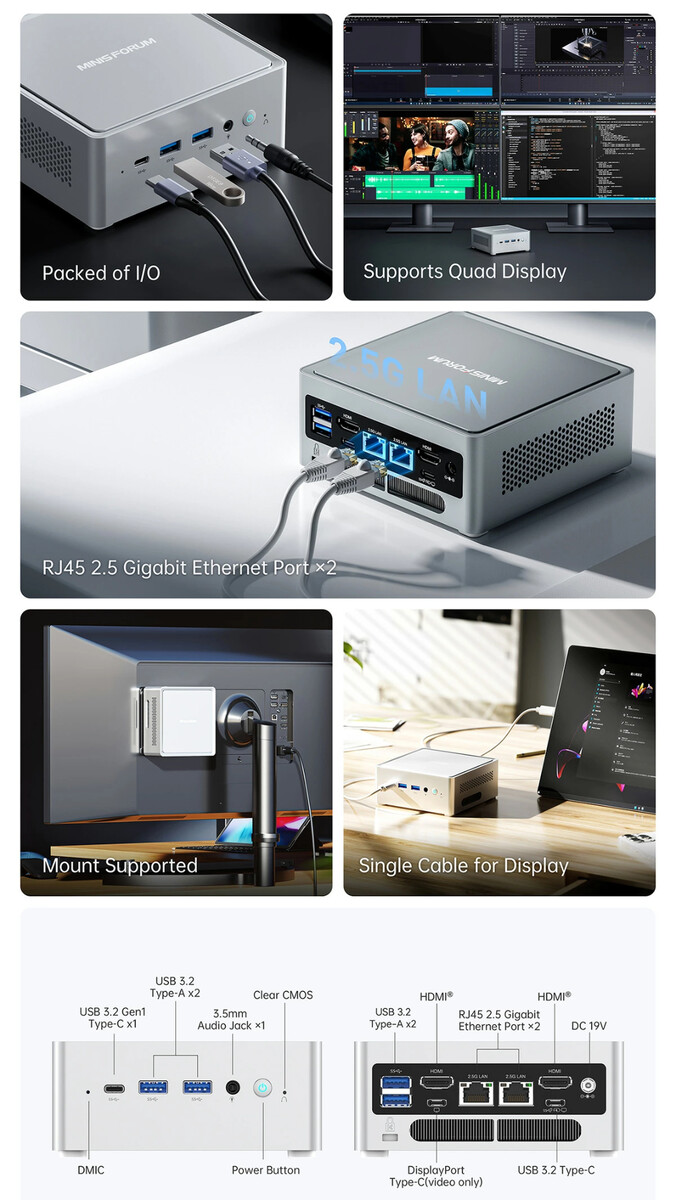 NAB3R har dessutom stöd för uppgraderingsbar lagring och RAM, men bara upp till 64 GB DDR4-3200 i det senare fallet. Trots detta har Minisforum inkluderat en aktiv kylningslösning för mini-PC:ns M.2 2280 SSD, samt en stor turbofläkt på undersidan. Som bilden nedan visar är NAB3R inte heller fattig på portar på baksidan.