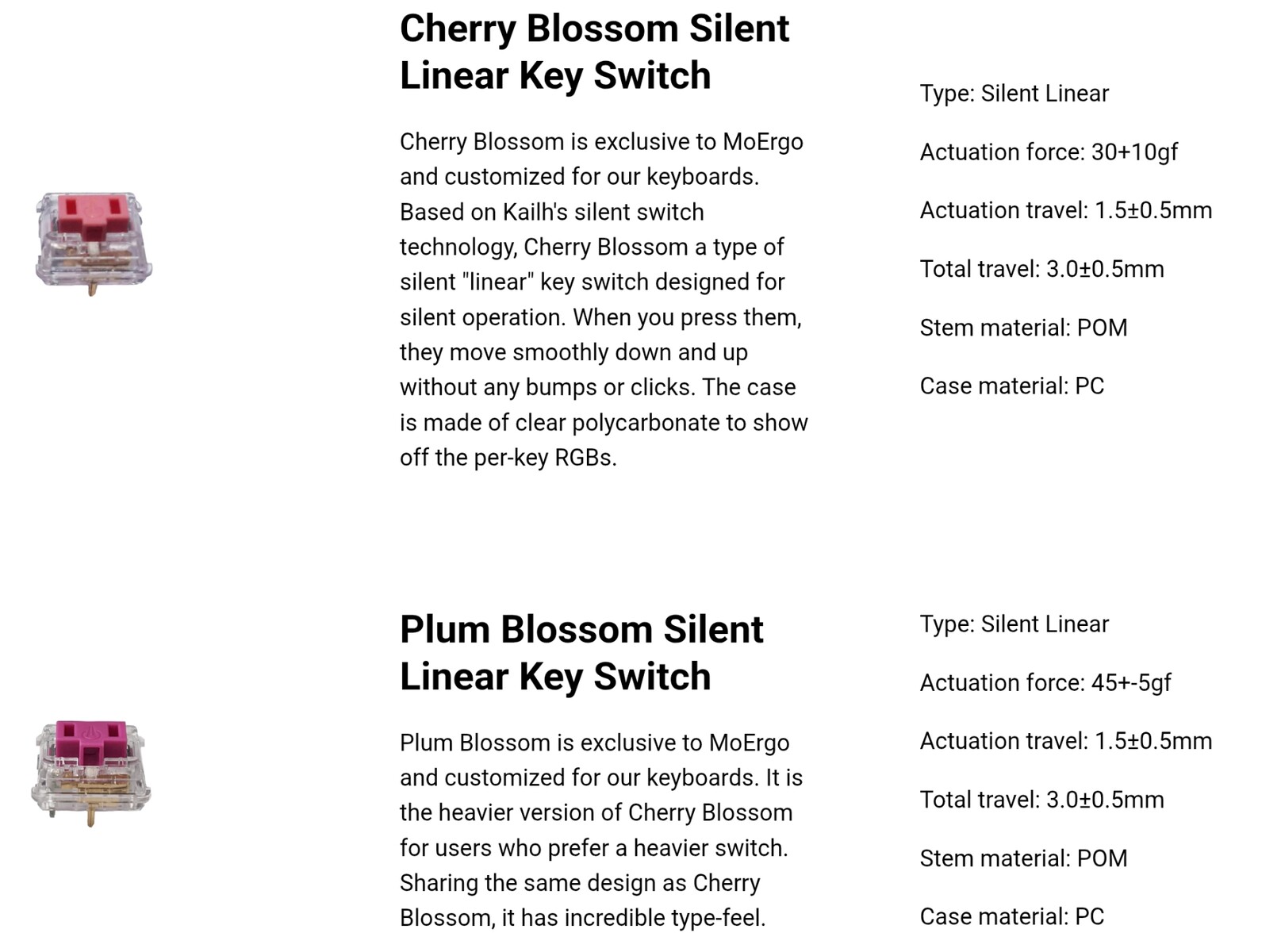 Till att börja med har det nya tangentbordet hot-swappable lågprofilerade Kailh Choc V1-omkopplare, men den här gången levereras det med tysta Cherry Blossom-omkopplare, som är exklusiva för MoErgo och Go60 specifikt. Precis som den ursprungliga Glove80 har Go60 POM-knappsatser, vilket ger en premiumkänsla och förbättrad kemisk resistens jämfört med material som ABS och till och med PBT.