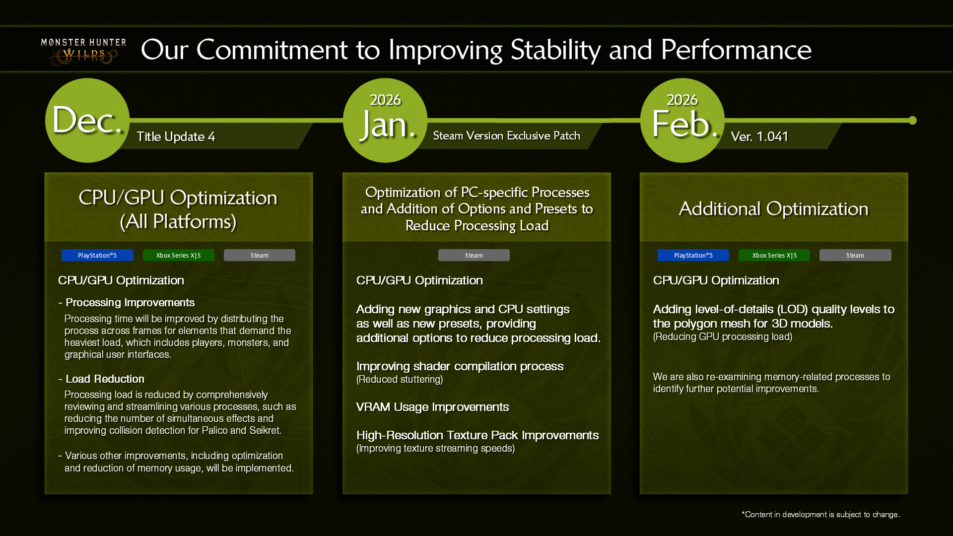 Enligt Daniel Owens testning har minsta FPS förbättrats med 8% sedan Title Update 4 och hela 20% sedan Title Update 3. Anledningen till att prestandan har påverkats på detta sätt verkar specifikt vara optimeringar som gjorts för shader-kompilering och texturströmning. Tillsammans med buggfixen har detta resulterat i att Wilds har dramatiskt lägre CPU-prestanda och GPU VRAM-krav, vilket var två stora smärtpunkter för PC-versionen.