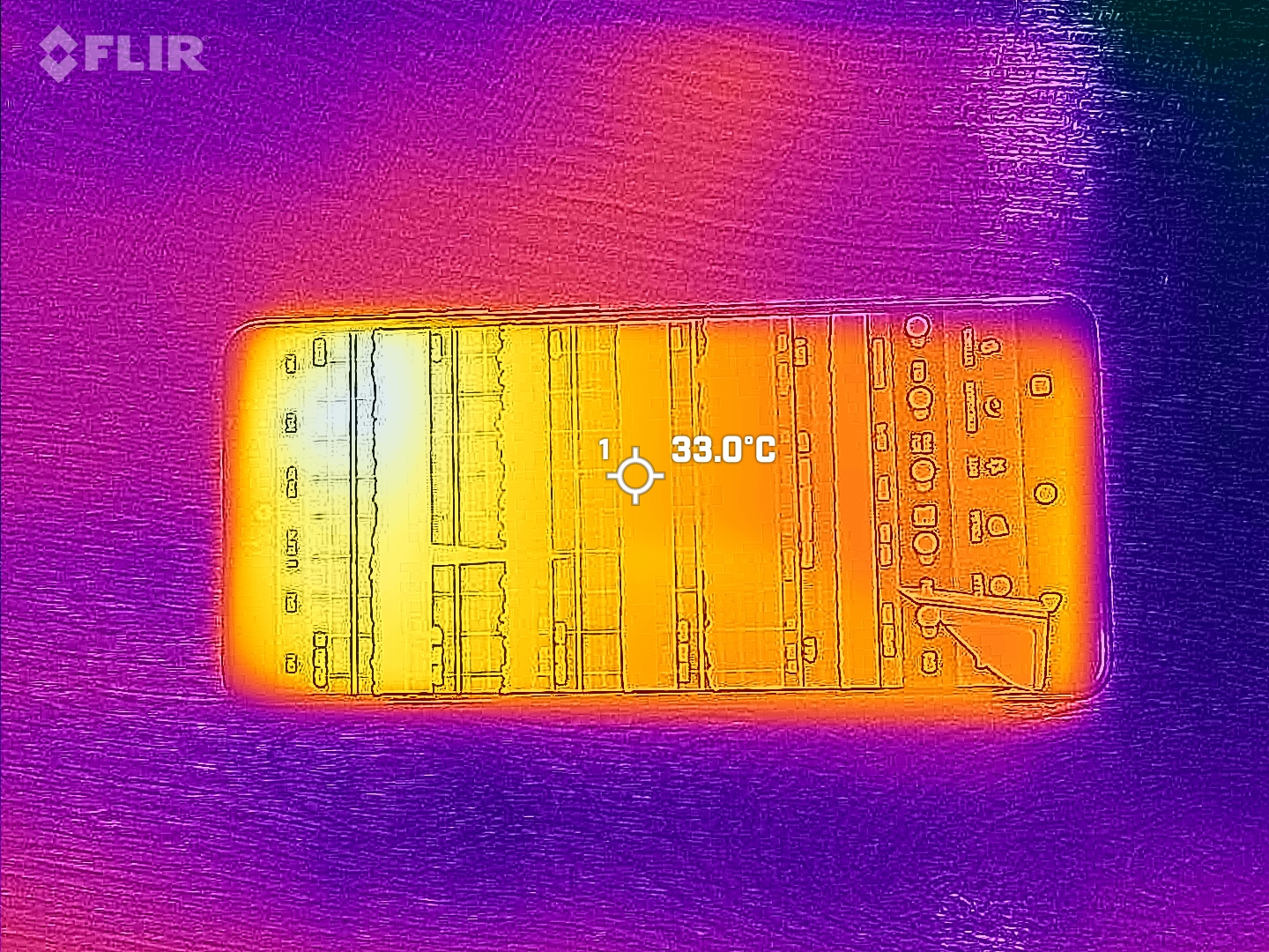 Efter 1 timme av vårt stresstest mätte vi Moto G24:s yttemperaturer. Resultatet: 39,1 °C var det högsta värde vi noterade - det är märkbart men inte kritiskt. Vi mätte dock detta i rumstemperatur, så det kan lätt bli ännu högre på sommaren eller i varma miljöer. SoC:ns prestanda stryps inte ens efter långvariga scenarier med full belastning.