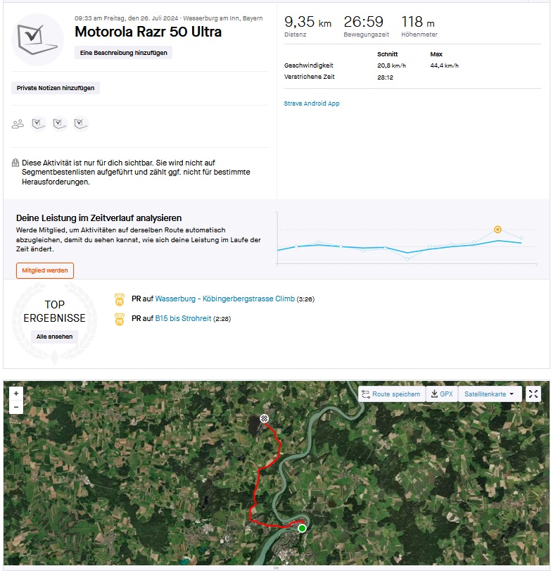 Om du går ut med telefonen lokaliseras du omedelbart med en noggrannhet på 3 meter, vilket är ett vanligt värde. Naturligtvis genomförde vi också ett praktiskt test och tog Razr+ med oss på en cykeltur. Vi tog med oss Garmin Venu 2 smartwatch för att jämföra, som har mycket exakt spårning.