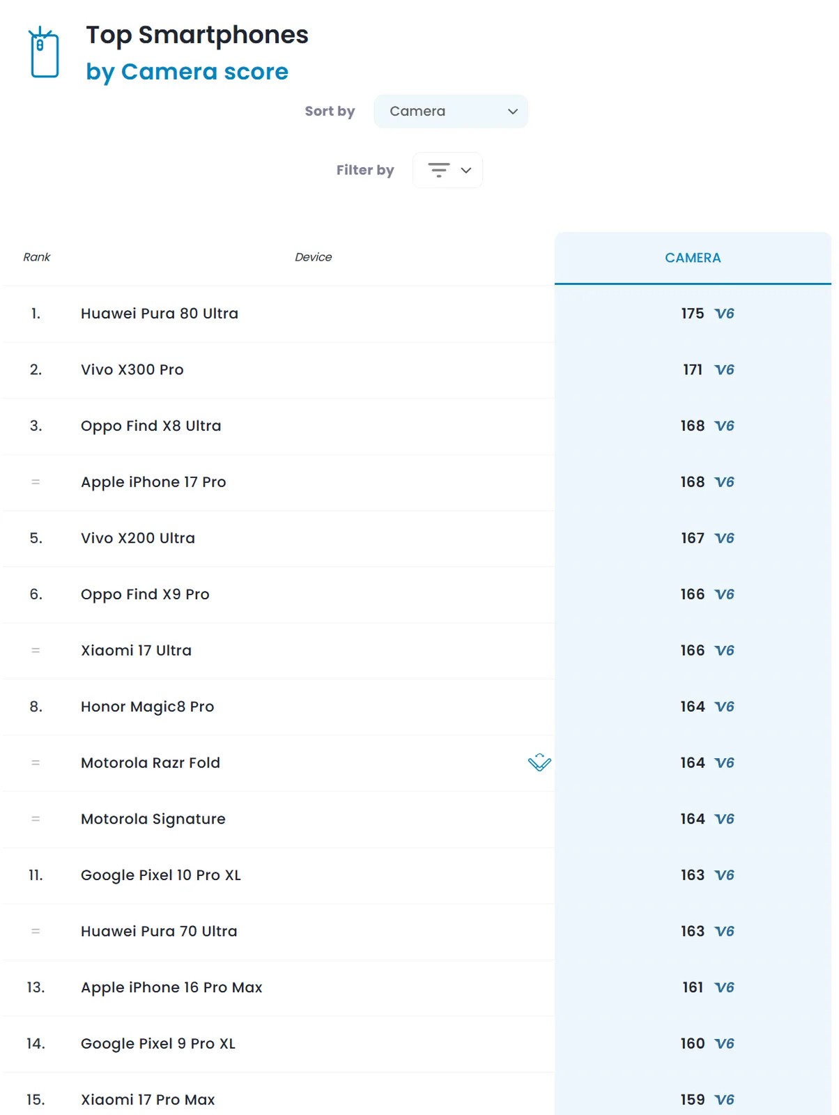 Som tabellen nedan visar klarar Razr Fold inte av att mäta sig med moderna flaggskepp som iPhone 17 Pro, Hitta X9 Pro och Xiaomi 17 Ultra med sin poäng på 164 poäng. Under tiden, den Honor Magic V5 och Samsung Galaxy Z Fold7 är långt ner på denna lista (curr. $ 1 809 på Amazon). Till viss del hjälps denna poäng av Razr Folds starka tele- och ultravidvinkelkameror, som ofta är sämre än sina primära motsvarigheter på vikbara telefoner.