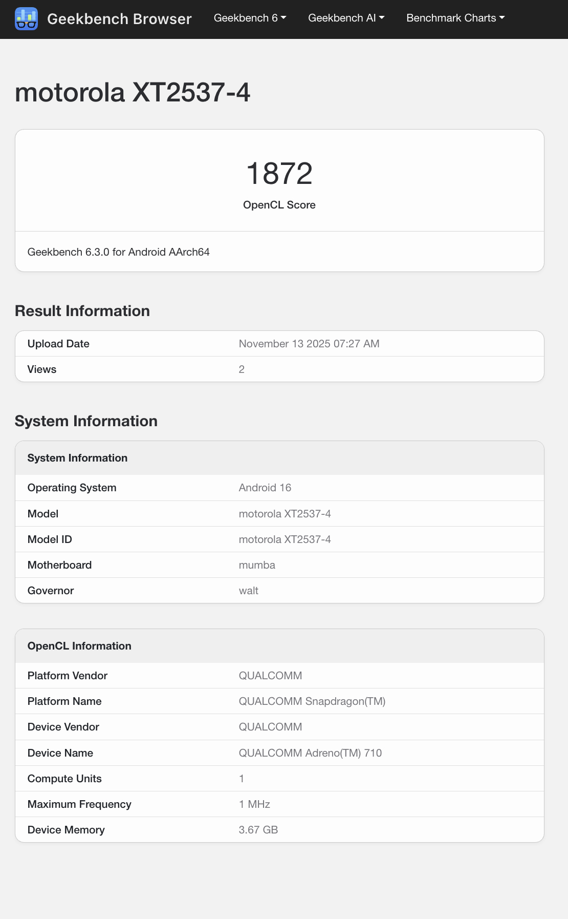 Ändå har en annan ny modell dykt upp på Geekbench före sin officiella lansering. För närvarande returnerar benchmarkingplattformen endast namnet 'Motorola XT2537-4', med XT2534-4 som en variant av rotmodellnumret 'XT2537'. Med detta sagt, indikerar flera källor att XT2537 avser Moto G76, en direkt efterföljare till Moto G75 som lanserades i oktober förra året med en Snapdragon 6 Gen 3-chipset. Däremot verkar det som att Moto G76 har Snapdragon 6s Gen 4, en chipset som Qualcomm presenterade för mindre än en månad sedan.