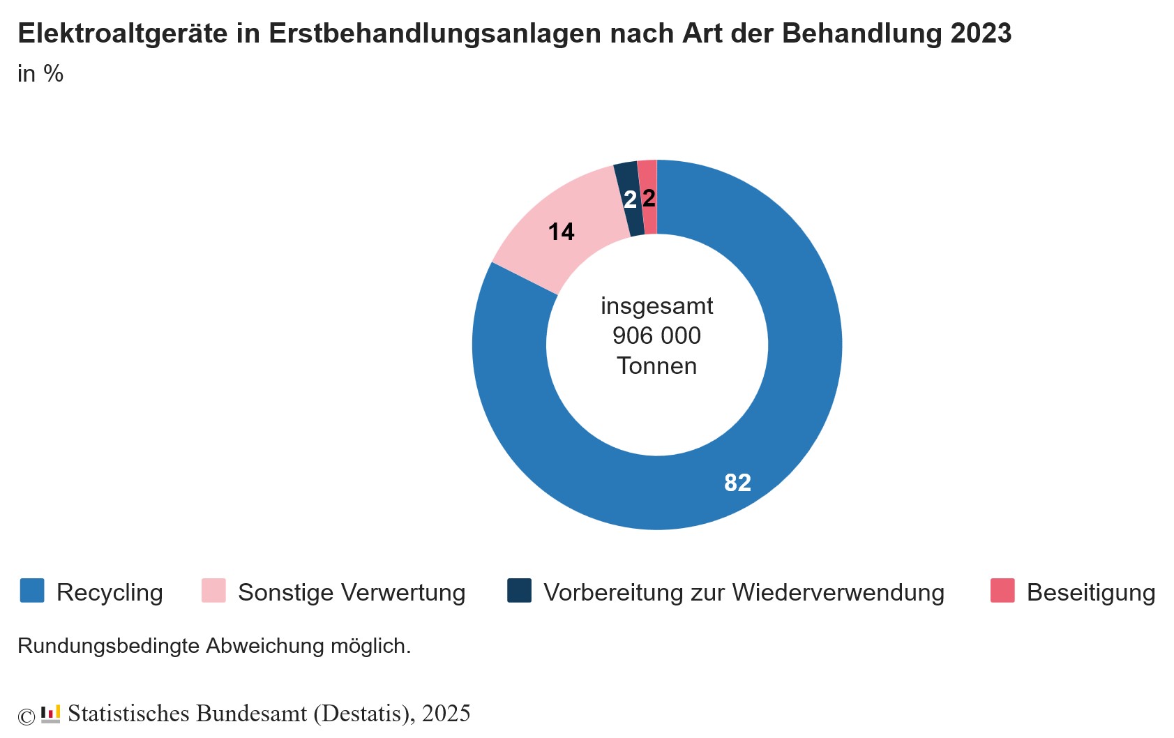 Återvinning av elektroniskt avfall i Tyskland är fortfarande en mycket viktig fråga för råvaruövergången. Enligt den tyska statistiska centralbyrån (Destatis) behandlades 906.100 ton elavfall vid certifierade anläggningar för primär behandling under 2023. Av detta återvanns 747.000 ton, vilket motsvarar en återvinningsgrad på 82,4%.