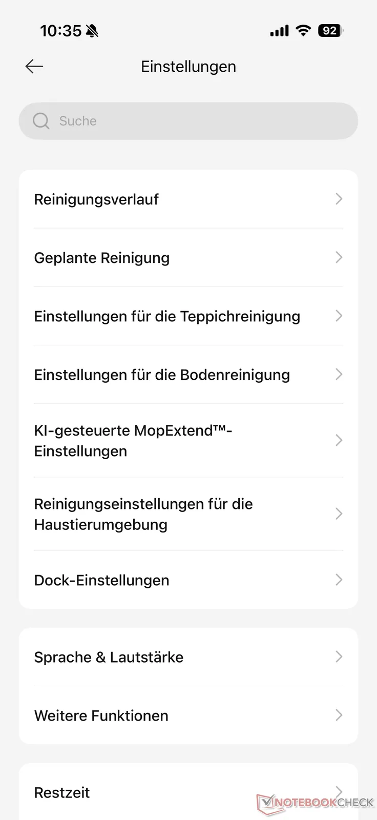 Förutom rengöringshistorik, firmwareuppdateringar och liknande erbjuder menyn olika andra inställningsmöjligheter som rör mattrengöring, MopExtend och dockan. Urvalet är inte lika stort som för vissa toppmodeller, men är helt tillräckligt för normala krav. En praktisk funktion är möjligheten att ladda under mindre belastade nattimmar, till exempel för att dra nytta av dynamiska elpriser.