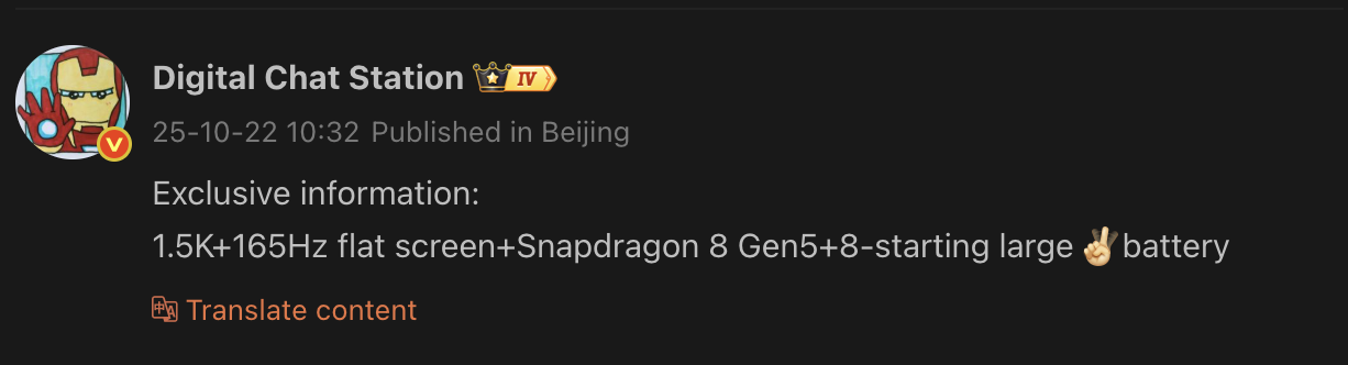 När det gäller tidslinjen för lanseringen föreslår tipsaren att enheten kommer att släppas i slutet av detta år. Detta stämmer överens med Snapdragon 8 Gen 5-lanseringen, vilket indikerar att den kan vara bland de första telefonerna med det nya chipsetet.