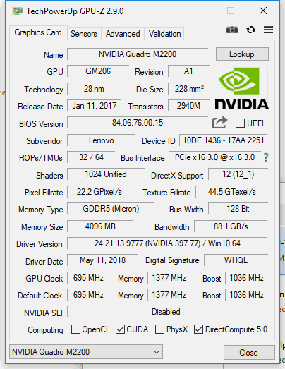 Den maximala kärn-klockfrekvensen hos Quadro M2200 är 1038 Mhz. Prestandan ligger mellan det äldre Quadro M2000M och Quadro M3000M, men är för det mesta närmare det sistnämnda (ibland även jämnbördig med). Det är inte överraskande att spelprestandan är jämförbar med Nvidia GeForce GTX 965M (Ti) och den är bara precis bakom den nya GeForce GTX 1050 (Pascal).