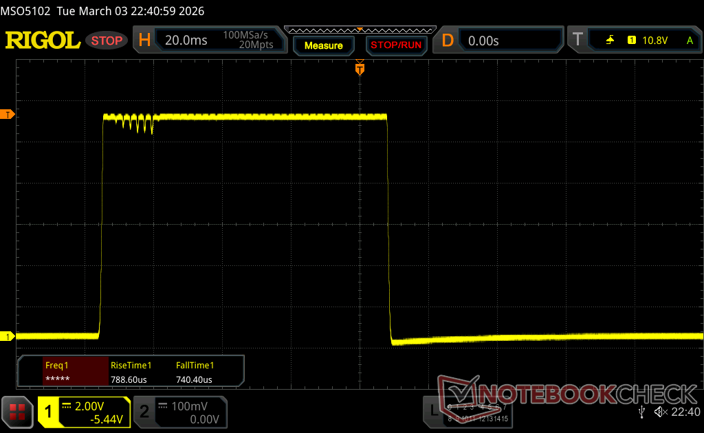 MSI förlitar sig på en OLED-pekskärm från Samsung (1.920 x 1.200 pixlar, 16:10). Det subjektiva bildintrycket är i grunden bra (djup svärta, starka färger, snabba svarstider), men frekvensen är bara 60 Hz och ljusa områden verkar något korniga. PWM-flimmer förekommer också vid 480 Hz, men amplituden är relativt låg.