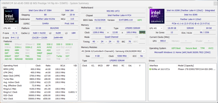 | MSI Prestige 14 Flip AI+ 2026 Ultra X7 358H, Arc B390 Panther Lake iGPU, Phison 1 TB ESR01TBTCCZ-27J, OLED, 1920x1200, 14" | Honor MagicBook Pro 14 2026 Ultra 5 338H, Arc B370 Panther Lake iGPU, YMTC PC411-1TB, OLED, 3120x2080, 14.6" | Asus ZenBook Duo UX8407AA Ultra X9 388H, Arc B390 Panther Lake iGPU, Samsung PM9C1b MZVL82T0HBL1, OLED, 2880x1800, 14" | Dell 14 Plus 2-in-1 Ryzen AI 7 350, Radeon 860M, , IPS, 1920x1200, 14" | Lenovo Yoga 7 2-in-1 14AKP10 Ryzen AI 5 340, Radeon 840M, WD PC SN7100S SDFPMSL-512G-1101, OLED, 1920x1200, 14" | Genomsnitt Intel Arc B390 12 Xe3 Panther Lake iGPU | Genomsnitt av klass Convertible | |