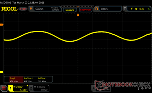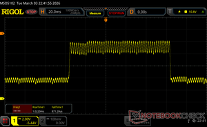 Displayens bakgrundsbelysning flimrar vid 480 Hz (i värsta fall, t.ex. med PWM) Flimrande upptäckt vid en ljusstyrkeinställning på 100 % och lägre. Det ska inte finnas något flimmer eller PWM över denna ljusstyrkeinställning. Frekvensen för 480 Hz är relativt hög, så de flesta användare som är känsliga för PWM bör inte märka något flimmer. Det finns dock rapporter om att vissa användare fortfarande är känsliga för PWM vid 500 Hz och högre, så var uppmärksam. Som jämförelse: 53 % av alla testade enheter använder inte PWM för att dämpa skärmen. Om PWM upptäcktes mättes ett medelvärde av 7996 (minst: 5 - maximum: 343500) Hz. | |||