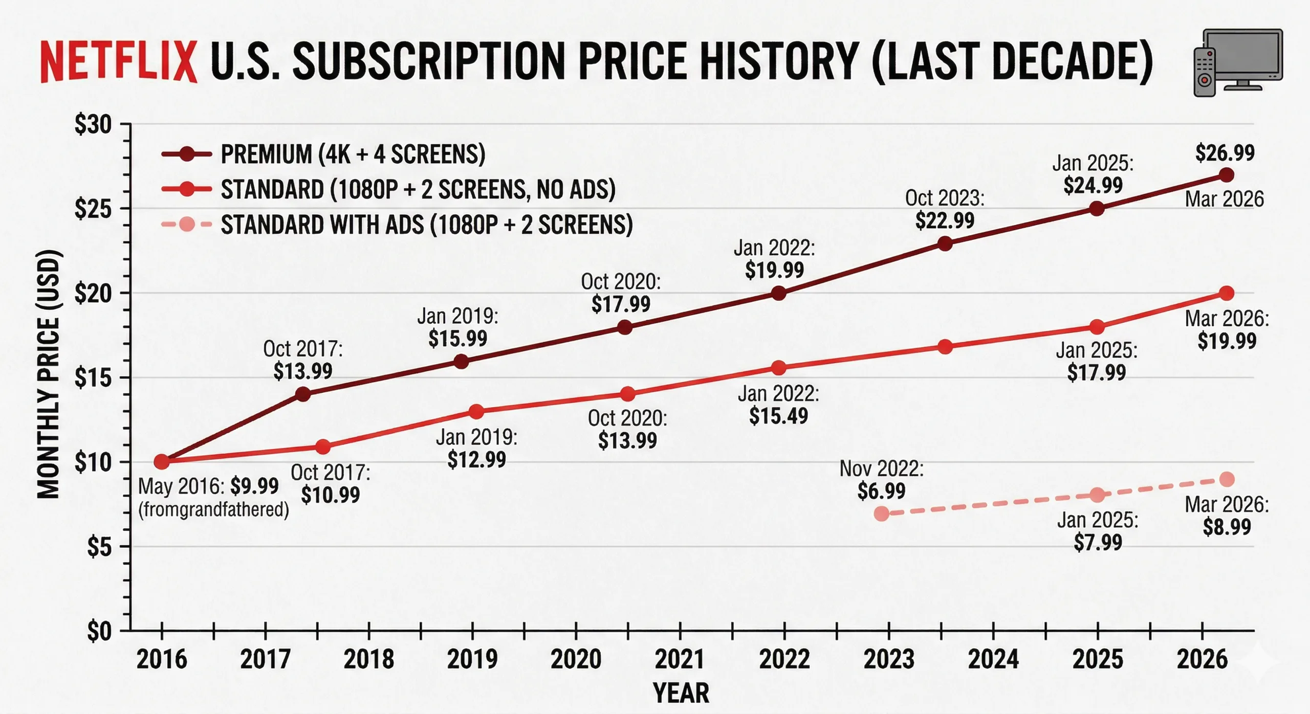 Netflix höjde just sina amerikanska prenumerationspriser för andra gången på ett år. Den nya matematiken börjar se ut som en direkt skatt på din hårdvara. Från och med den 26 mars 2026 har Premium 4K-nivån klättrat till $ 26,99 per månad, medan den annonsstödda startnivån ser ut att vara mer förankrad på $ 8,99. Detta skapar ett massivt prisdelta som i princip tvingar ett val mellan två saker som tidigare ansågs vara standard: upplösningen på din skärm och integriteten för dina vanor. Om du köpte en avancerad bärbar dator som en MacBook Pro M5 specifikt för dess 1 600-nit toppljusstyrka och Mini LED-skärm, tar Netflix nu ut en stor årsavgift bara för att se vad den skärmen faktiskt kan göra.