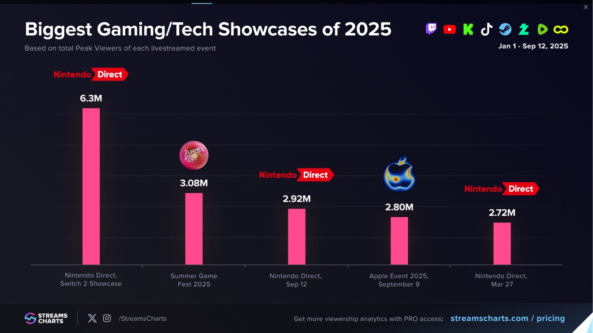 Nintendo och Apple har enorma följarskaror, och båda företagen håller stora evenemang inom några dagar från varandra. Åtminstone i den här striden kan den japanska speljätten ha väckt mer intresse. Streams-diagram visar att 12 september Nintendo Direct hade en topptittare på 2,92 miljoner tittare. Under tiden, det senaste Apple -evenemanget och iPhone 17 avslöja 2,8 miljoner samtidiga tittare.