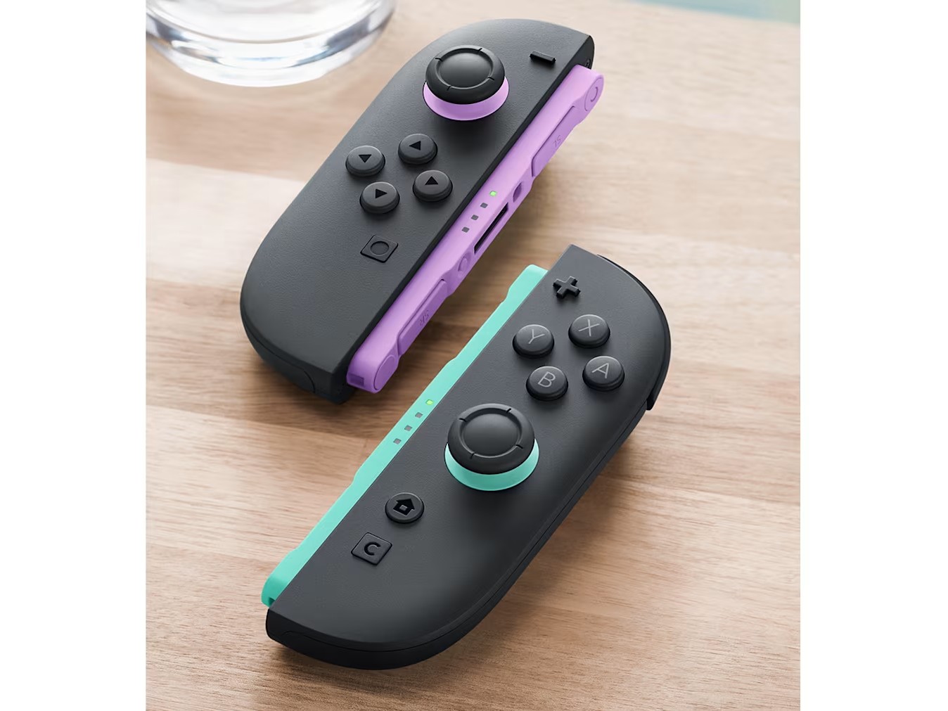 Liksom de ursprungliga blå och röda Switch 2 Joy-Cons är den nya uppsättningen till stor del färdig i svart, med ljuslila och ljusgröna accenter på joystickringarna och sidoskenorna. Färgerna är knappt synliga när de är monterade, men pastellfärgerna på joystickarna skapar ändå en subtil kontrast mot det mörkare skalet samtidigt som den övergripande designen hålls återhållsam. De nya nyanserna ser också mjukare och mer dämpade ut än de ursprungliga Joy-Cons.