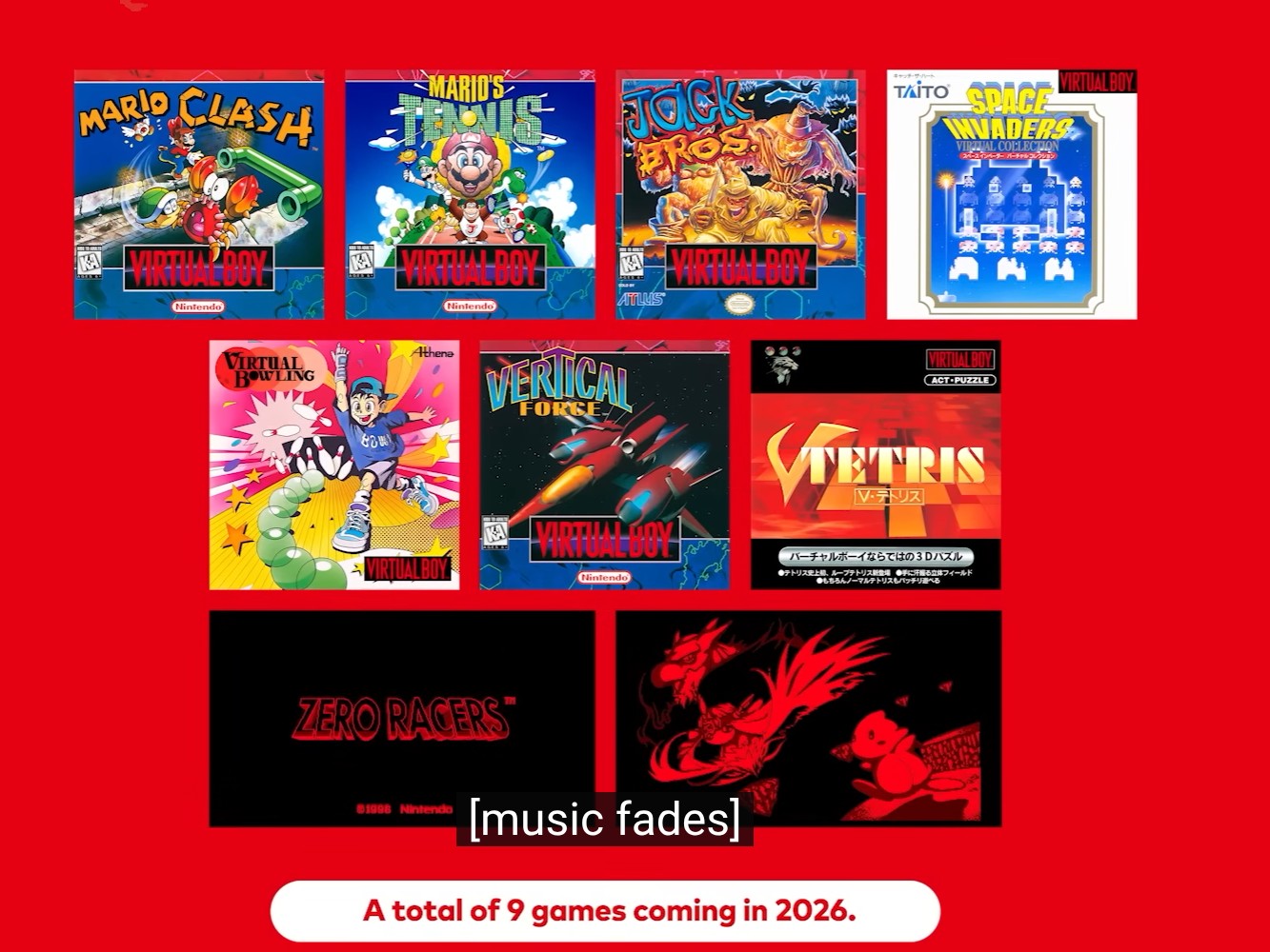 Andra spel som Nintendo säger kommer att läggas till senare under året är Mario Clash, Mario Tennis, Jack Bros, Space Invaders Virtual Collection, Virtual Bowling, Vertical Force och V-Tetris. Nintendo kommer också att släppa ytterligare titlar som inte ursprungligen släpptes när Virtual Boy ursprungligen lanserades 1995. Dessa spel är Zero Racers och D-Hopper, och de kommer också att släppas i år.