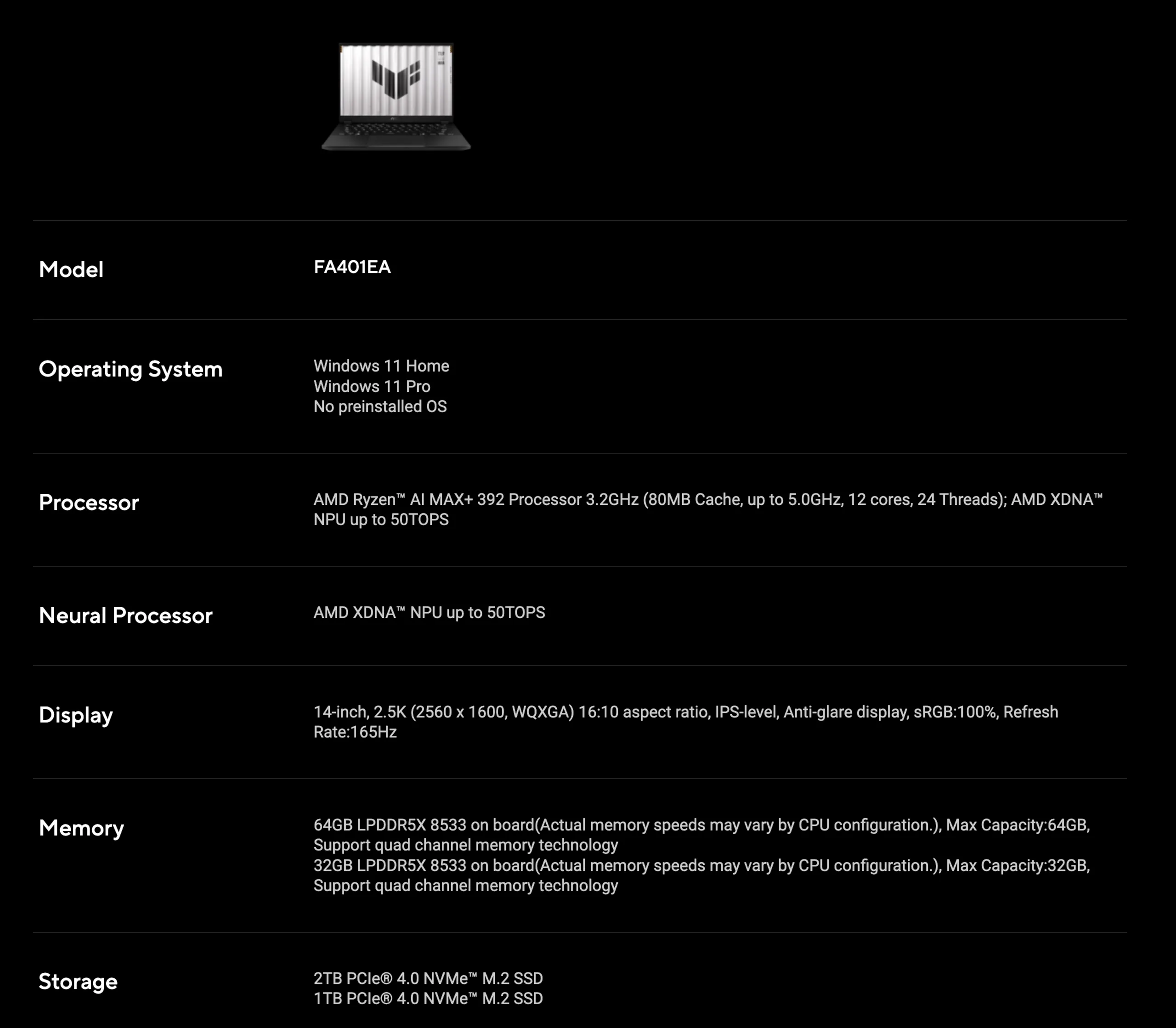 Förmodligen valet av de två är Asus FA401EA-variant, som har slagit ROG Zephyrus G14 för att anta AMD: s Strix Halo-plattform. Specifikt har Asus valt Ryzen AI Max+ 392som AMD presenterade under CES 2026 med 12 kärnor, 24 trådar och en Radeon 8060S iGPU. Även om den är mindre kraftfull än Ryzen AI Max+ 395 som finns i ROG Flow Z13 på CPU-sidan av saker och ting, bör TUF Gaming A14 matcha sin 2-i-1-motsvarighet när det gäller GPU-prestanda.