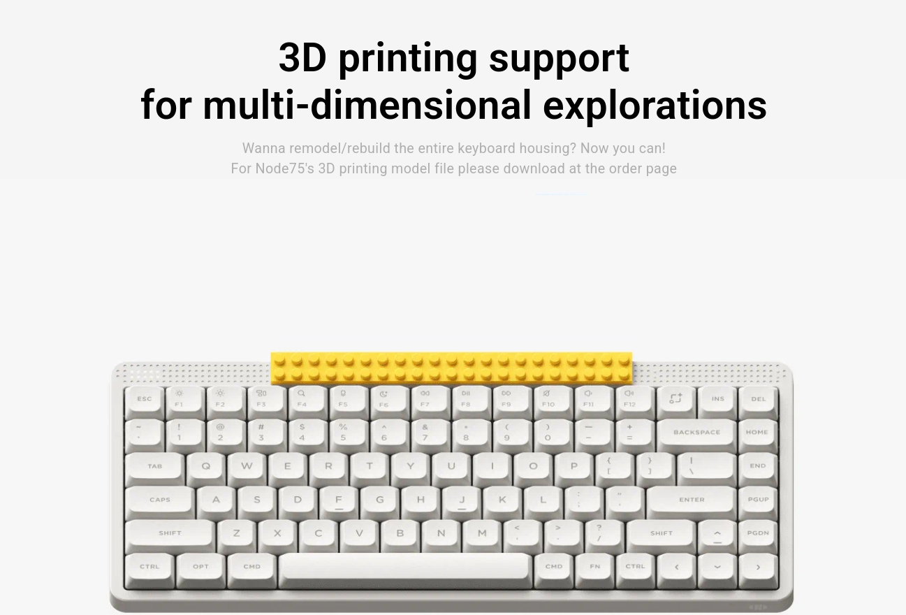 Precis som med NuPhy Kick75, som vi tyckte om i vårt testhar NuPhy publicerat 3D-modeller för Node75 för att möjliggöra djupare anpassning och personalisering, vilket alltid är en trevlig touch. 3D-modellerna i fråga är en penndocka, en barbricka, ett telefonställ, en displaydocka, ett tegelstensfäste (som i legobitar), ett kepsfäste och ett kortstöd. Om du är tillräckligt skicklig eller ambitiös bör du kunna använda eller modifiera dessa delar för att skapa dina egna tillägg till Node75.
