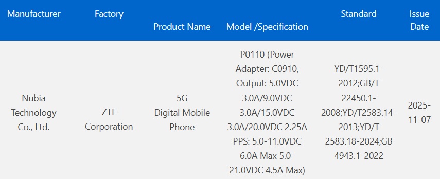 Smarttelefonens 3C-certifiering, som utfärdades nyligen, avslöjar att Nubia P0110 kan levereras med en 94.5-laddare, vilket innebär att den också är en toppkonkurrent i laddningsavdelningen.
