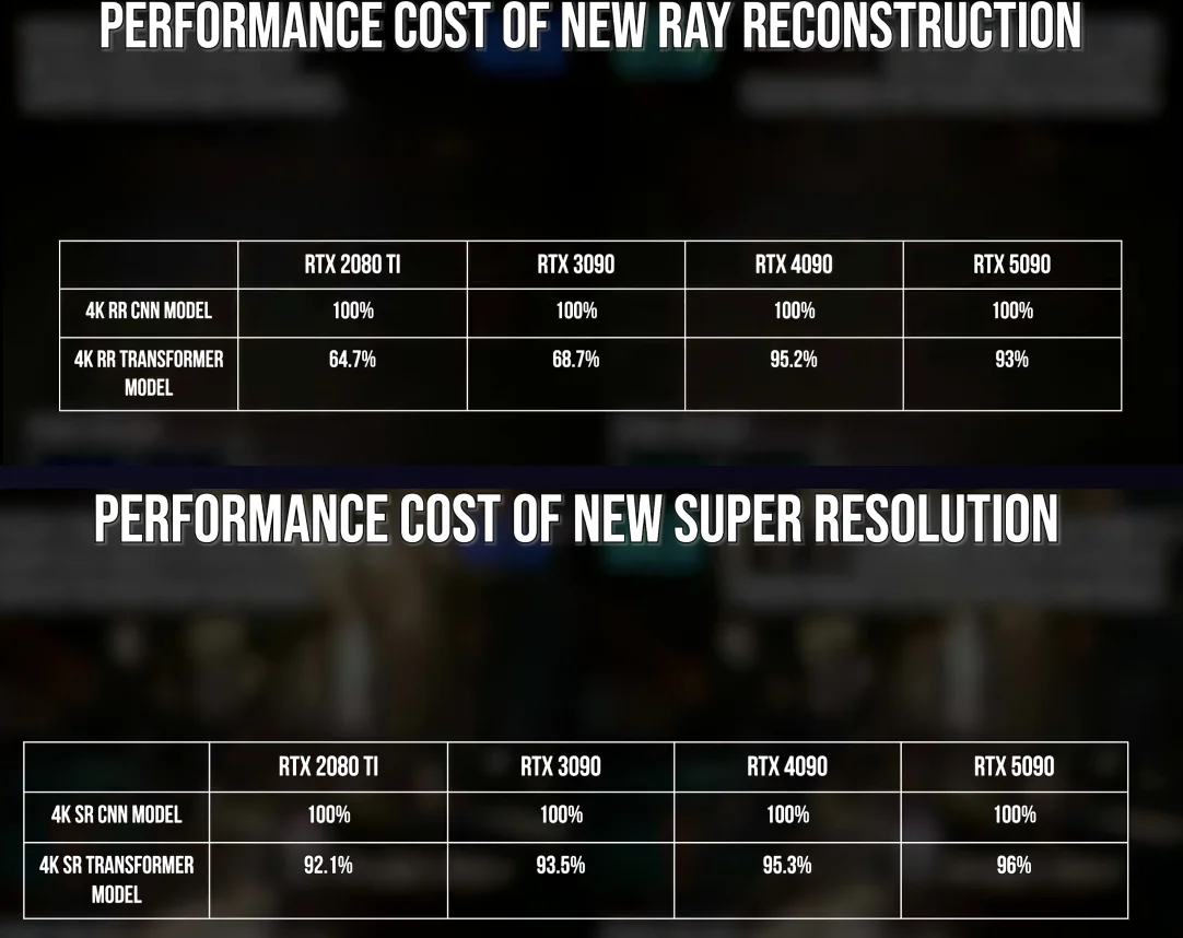 DLSS 4:s Transformer kommer med en del prestandaöverskott. Som noterats av Digital Foundry i deras DLSS 4 djupdykningupplever korten i Turing RTX 20-serien och Ampere RTX 30-serien en hög straffavgift med Transformer eftersom deras Tensor-kärnor endast stöder FP16-inferens inbyggt.