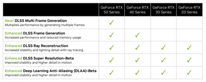 Två funktioner är särskilt viktiga för gamers: Den nya DLSS4 med en transformatormodell samt multiramgenerering. DLSS4 består av flera olika tekniker och vissa av dem stöds även av äldre generationer. Den nya transformatormodellen (ersätter convoluted neural networks) ska förbättra bildkvaliteten avsevärt. Under våra tester märkte vi att det nästan inte finns någon synlig skillnad mellan olika DLSS-kvalitetsinställningar längre.