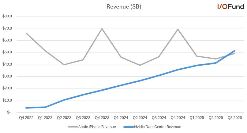 Enligt siffror som rapporterats av I/O Fund (via Beth Kindig på X) slog Nvidias datacenterintäkter för Q3 2025 Apple's iPhone iPhone-intäkter för första gången någonsin.