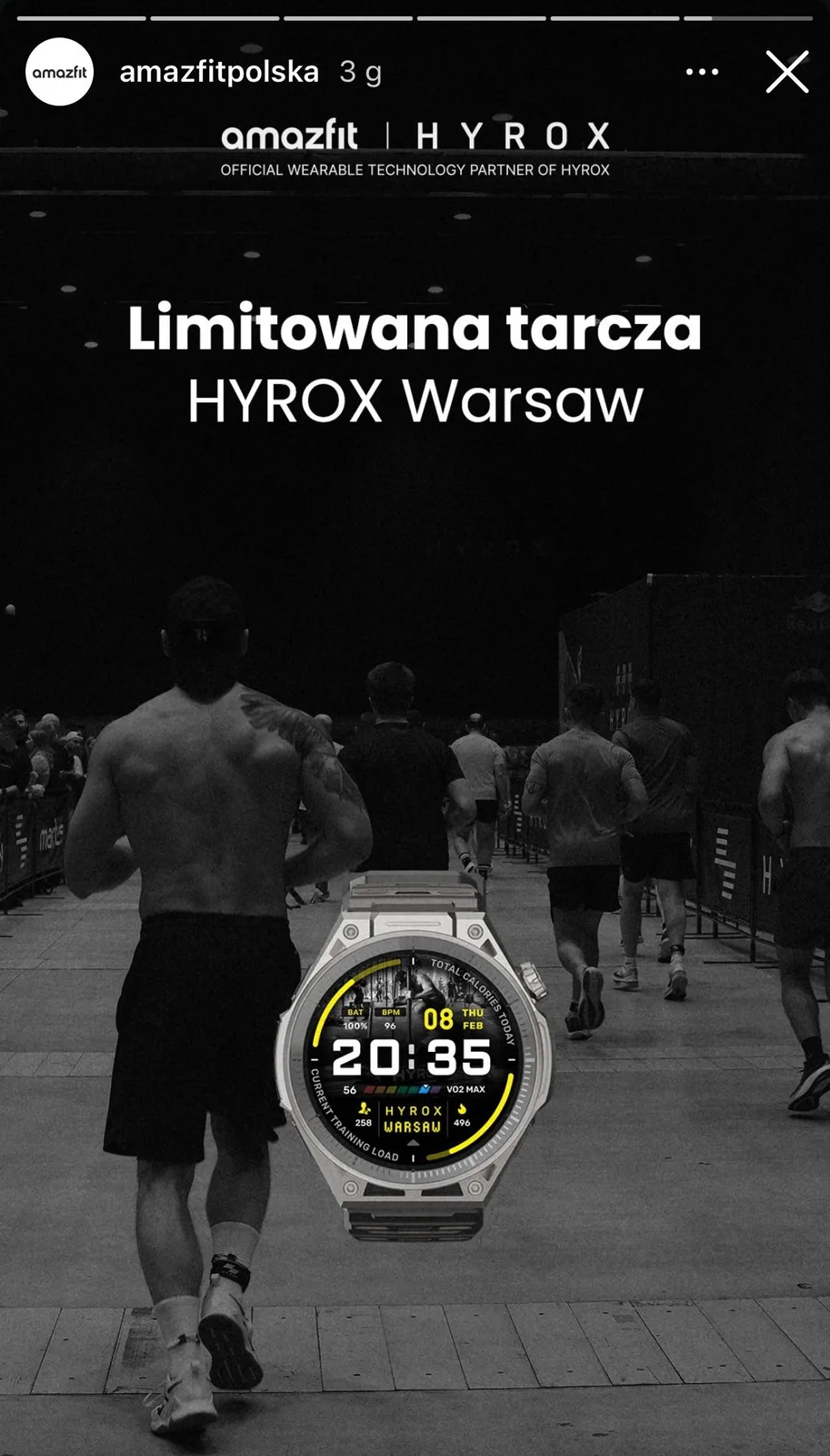 Nu har en bild och en video av den outgivna Amazfit-smartklockan dykt upp på officiella Amazfit Poland Instagram-konto. Detta innehåll, som sedan dess har tagits bort av företaget utan kommentar, marknadsförde det kommande HYROX Warsaw-evenemanget. En bild (nedan) innehöll texten "Begränsad upplaga HYROX Warsaw ansikte" (maskinöversatt).