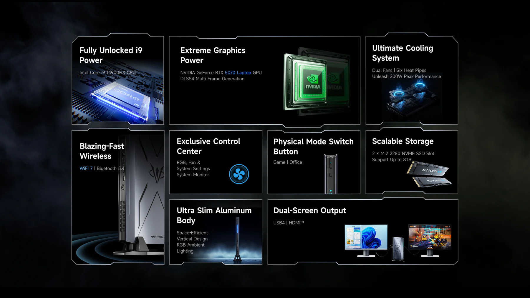 Dessutom kan AtomMan G7 Pro endast konfigureras med en Nvidia GeForce RTX 5070 gPU för bärbara datorer, som Minisforum håller sval med sex värmeledningsrör, dubbla fläktar och ett tresidigt avgassystem. Tydligen gör detta kylsystem att AtomMan G7 Pro kan dra upp till 200 W under stresstester med Game Mode aktiverat. I annat fall drar mini-PC:n upp till 150 W i "Office Mode".