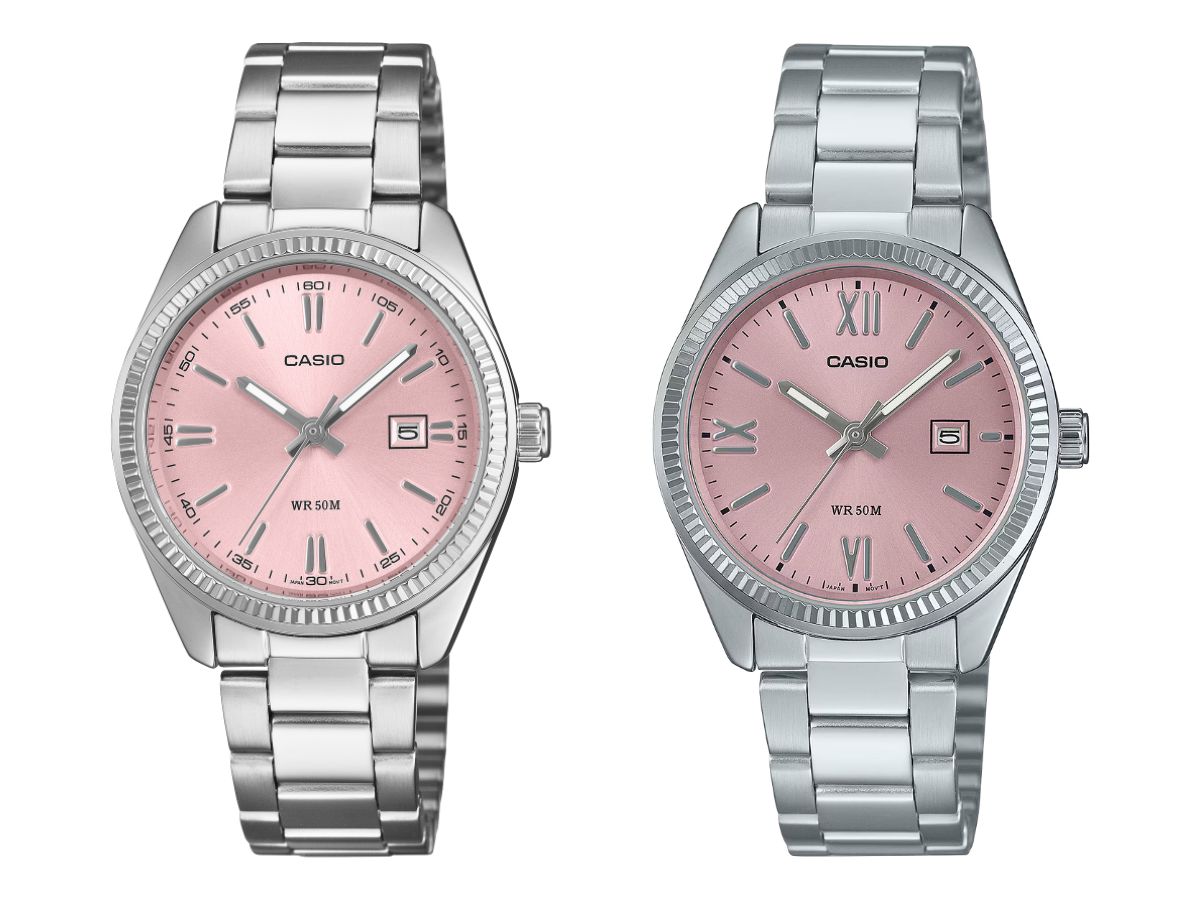 Casios nya LTP-1302PD-4AV har en pastellrosa sunray-urtavla med silverfärgade index och visare. Dessa matchar det omgivande silverfärgade förkromade höljet, som mäter 34,5 x 30,2 x 8,7 mm (~1,36 x 1,19 x 0,34 tum). Denna modell har också ett armband i rostfritt stål och en räfflad boettring.