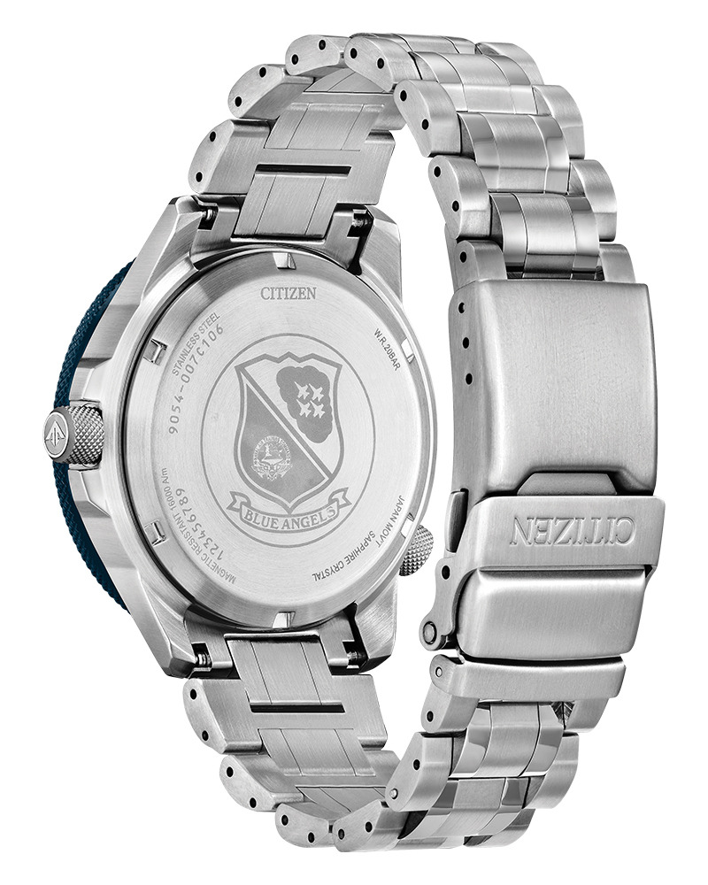 En framträdande Blue Angels-logotyp är tryckt på urtavlan och graverad över boettens baksida. Den graverade boettbacken visas tydligt på de läckta bilderna, tillsammans med modellens referens- och vattenresistansmarkeringar. Kronan och sekundärkontrollen vid klockan två har räfflade metalltexturer. Inuti klockan finns Citizen's Caliber 9054ett automatiskt GMT-urverk med hackande sekunder och möjlighet att självständigt justera den lokala timvisaren när du reser. Klockan är försedd med ett safirglas och ett armband i rostfritt stål med tryckknappslås och graverat varumärke. Vattentåligheten är angiven till 200 meter.