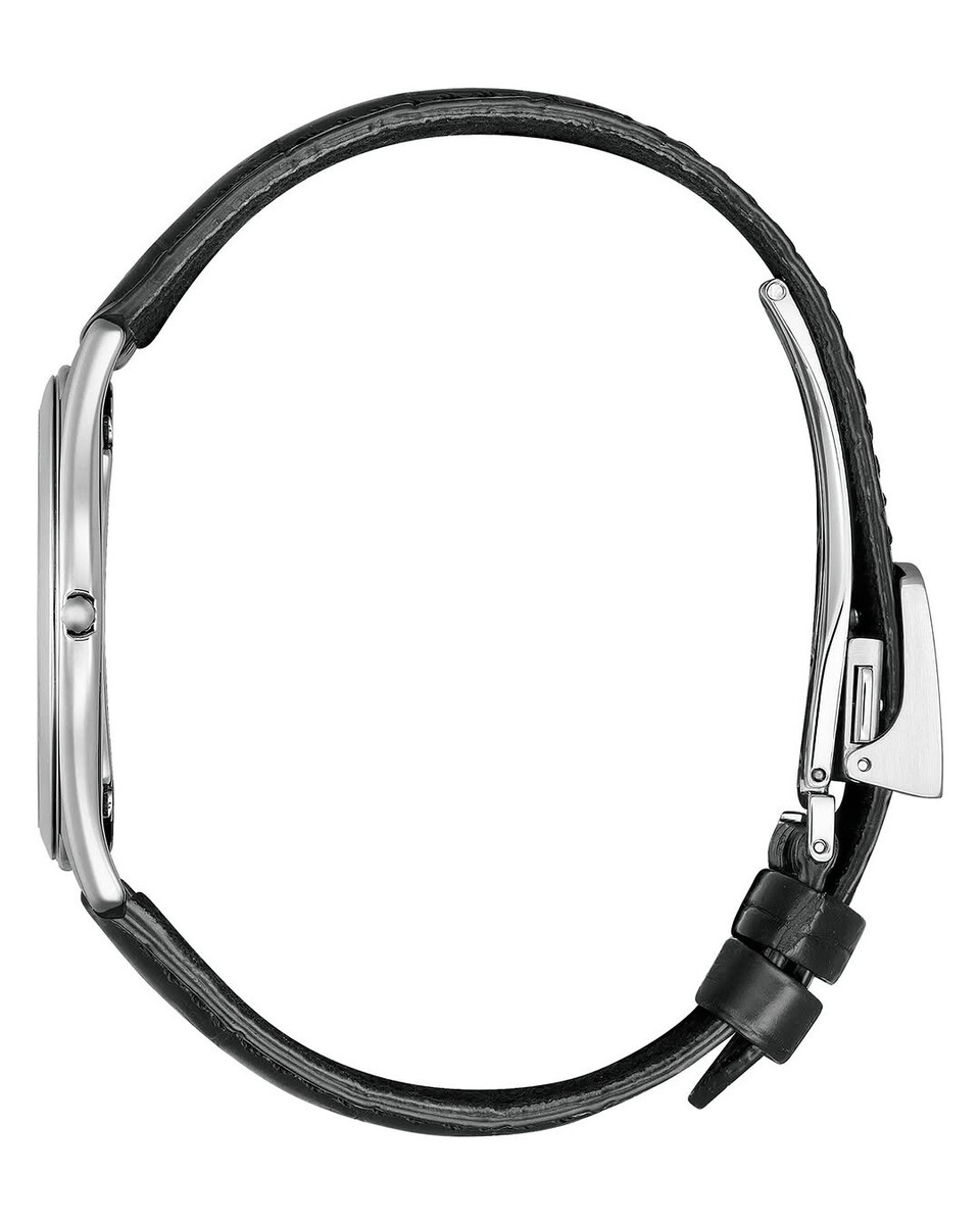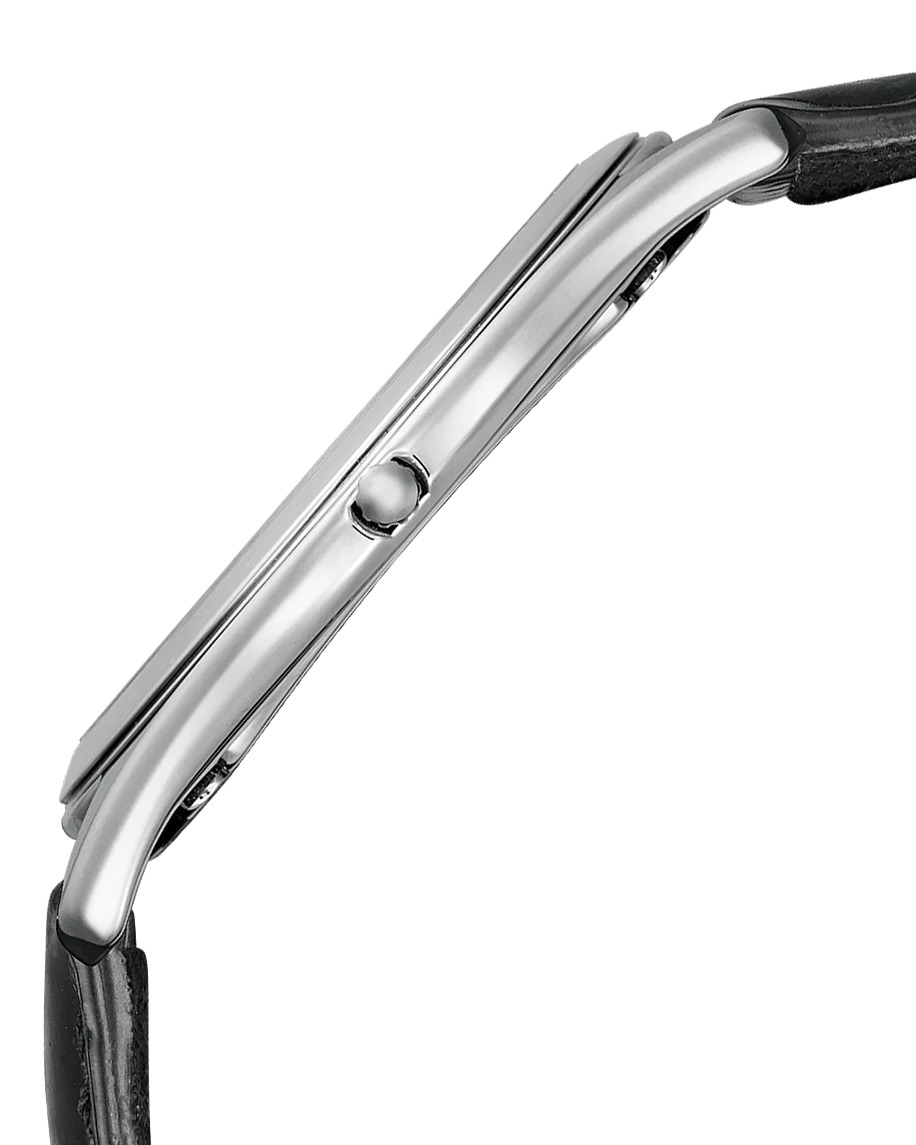 AQ5010-01A har en boettdiameter på 36,6 mm, vilket är måttligt och passar för formella tillfällen. Klockan har en ljusvit urtavla, gyllene visare och en svart sekundvisare som ger urtavlan en skiktad känsla. Kapitelringen är inramad i svart, vilket ger urtavlan en stark kontrast utan att försämra läsbarheten. Allt detta är parat med ett blankt svart läderarmband präglat med ett krokodilmönster.