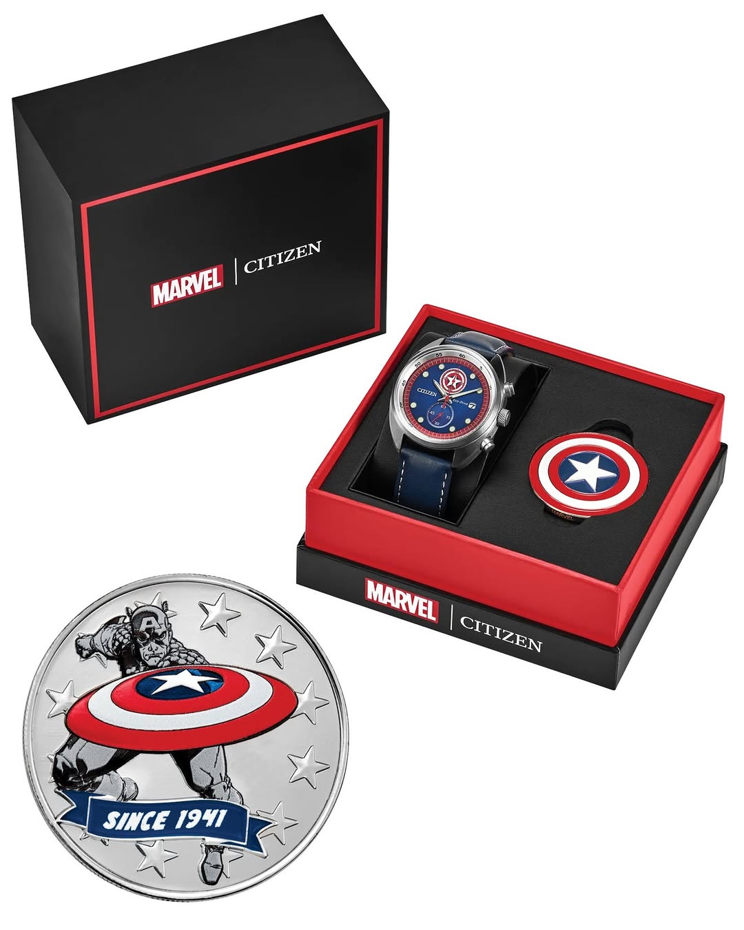 Det kompletta presentationssetet inkluderar ett Captain America samlarmynt, som visas separat i förpackningen. Myntet avbildar Captain America hållandes sin sköld med texten "Since 1941", som en referens till året då karaktären först dök upp. Själva förpackningen matchar temat för samarbetet, med Marvel- och Citizen-varumärken tillsammans med en röd och svart layout.