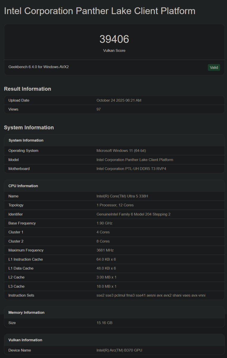 Core Ultra 5 338H har dykt upp på Geekbench med en aldrig tidigare visad iGPU: Arc B370. Namnet är lite missvisande eftersom B:et antyder att den är baserad på Xe2 Battlemage-arkitekturen och inte Xe3 Alchemist. Eller så är det sannolikt ett fall där Geekbench felidentifierar en GPU i vad som helt klart är en förproduktionsbärbar dator
