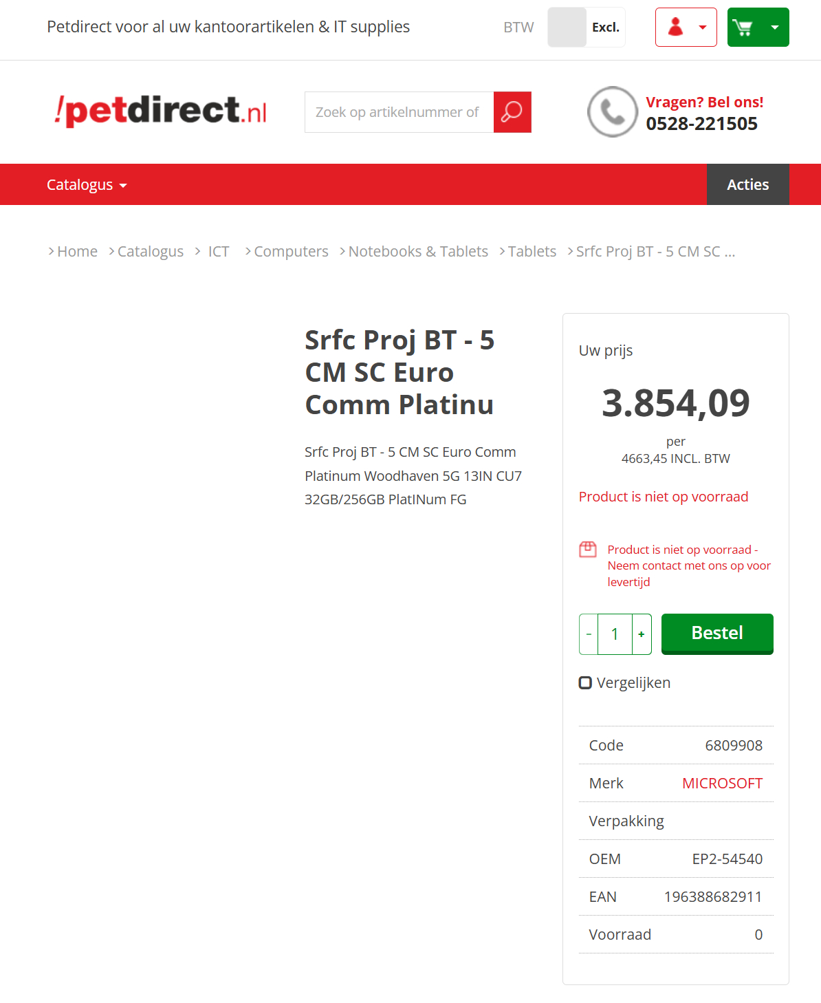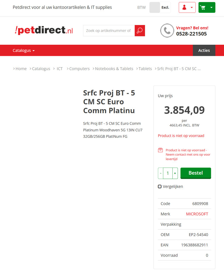 Nu verkar det som om en av dessa nya Surface-enheter har dykt upp på den holländska återförsäljaren Petdirect. På ytan är Petdirects notering ganska dunkel. Quandt tillade dock att "Woodhaven" är Microsofts kodnamn för sin nästa Surface Pro "for Business" -utgåva.