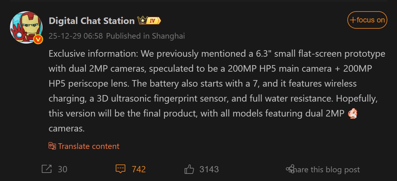 Denna platta OLED-panel rapporteras ha en 3D ultraljudsfingeravtryckssensor i displayen. Vad som är ganska intressant är att Digital Chat Station tillägger att Find X9s kommer att ha en dubbel 200 MP-kamerakonfiguration. Läckan delar att den förväntas ha en 200 MP HP5 som huvudkamera och som telefoto-sensor.
