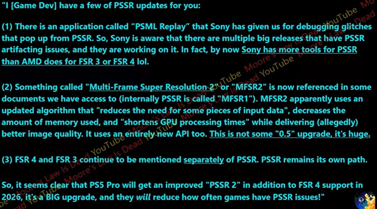 Moore's Law Is Dead var den första läckan som avslöjade PlayStation Spectral Super Resolution (PSSR) i detalj före debuten av PS5 Pro. I maj 2025 rapporterade läckan att Sony höll på att utveckla PSSR2 för att uppnå bättre bildkvalitet med mindre resurser. MLID har nu påstått några fler detaljer angående PSSR2.