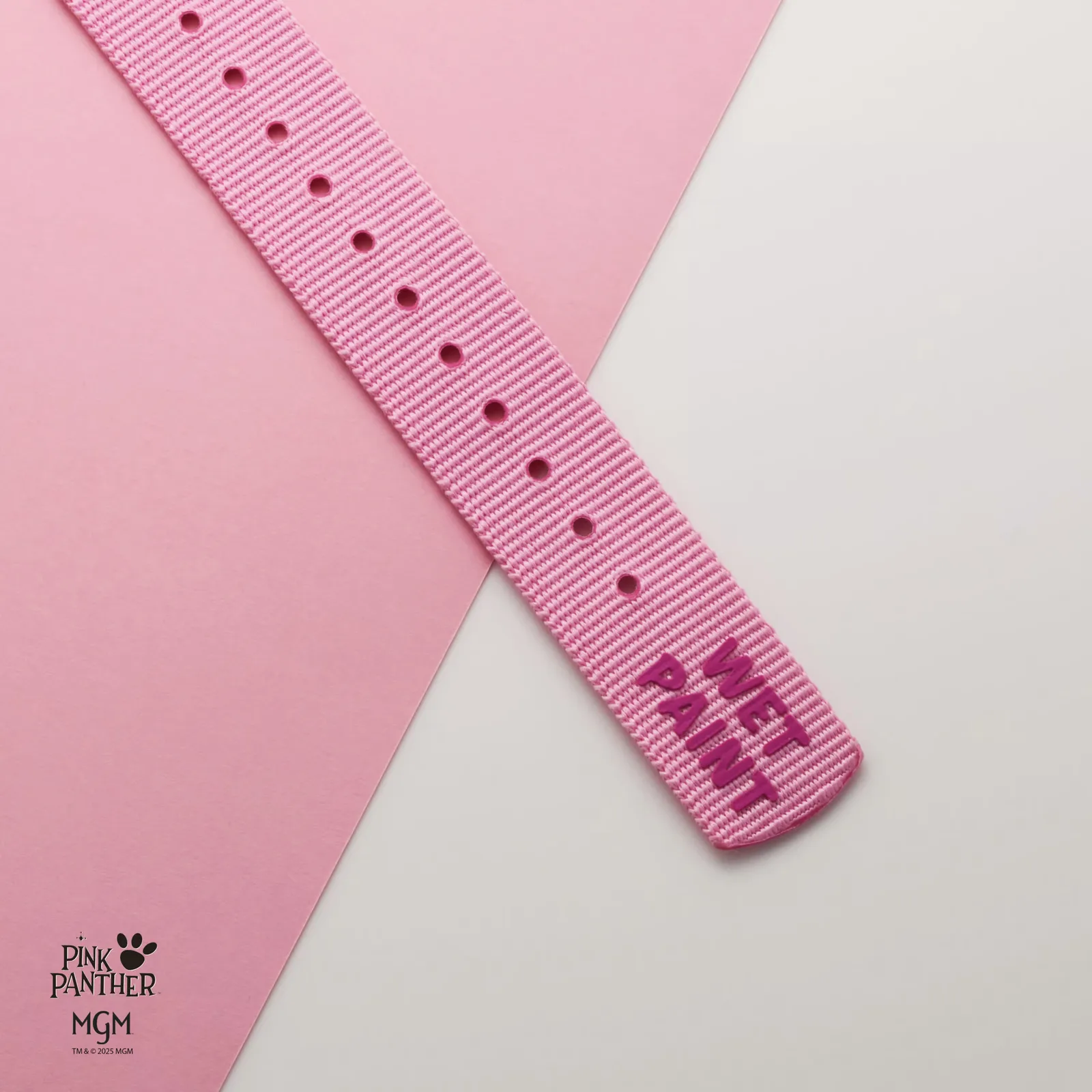 Redan från början borde urtavlan dra till sig folks blickar. Den har en mättad rosa ton med Pink Panther-tassavtryck som pressats in i ytan. Sekundvisaren är också rosa och på boettens insats blandas rosa minutmarkeringar med en svart ring för att skapa lite kontrast. Ett fönster för dagsdatum sitter vid klockan tre och luren har samma standarddesign som 5 Sports. På baksidan finns ett rosa utställningsfönster som visar Panthers ögon och karaktärens logotyp som är tryckt över glaset.