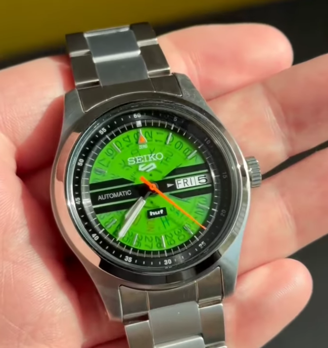 De nyligen upptäckta praktiska bilderna, tack vare @SeikoLeaks på YouTubeger oss en praktisk titt på hur "HUF Green" acetat urtavlan interagerar med ljus. Som väntat finns det en hög grad av transparens som avslöjar de mekaniska dag- och datumhjulen under ytan. Urtavlans utförande, inspirerat av 1970-talets "Time Sonar", skapar en skiktad, tredimensionell effekt som normalt inte ses i Seiko 5:s instegsmodell. Medan reklambilder ofta renodlar dessa texturer, avslöjar de fysiska bilderna en unik industriell karaktär, med det svarta horisontella "Automatic"-fältet och "huf"-logotypen vid klockan 6 som verkar flyta ovanför den gröna disken.
