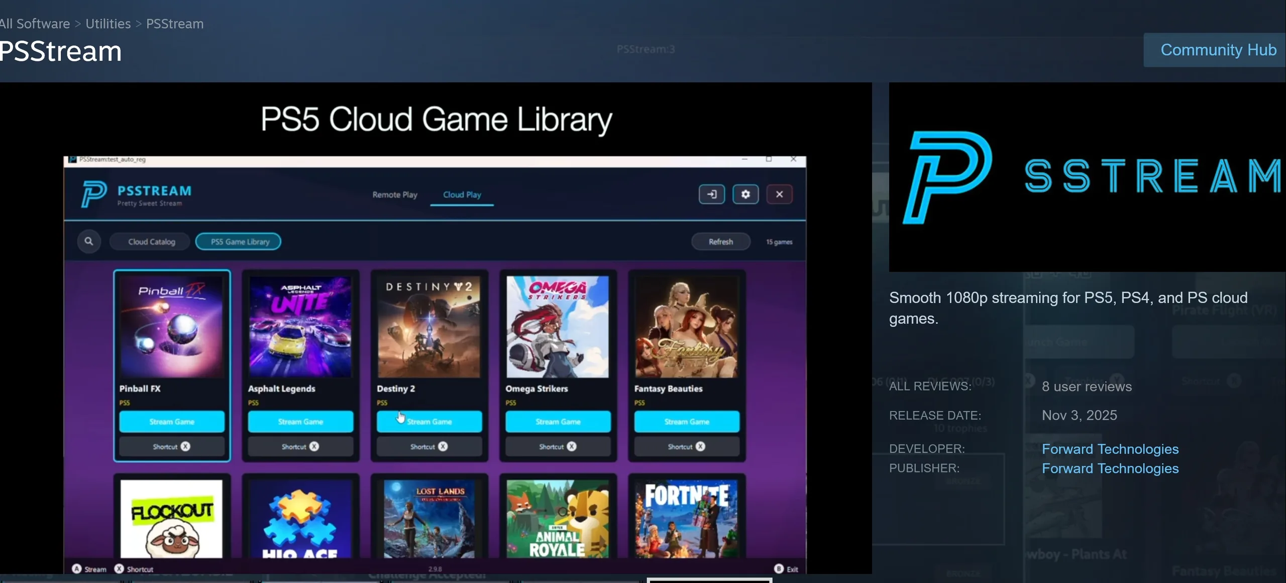 Som visas i en video från dess utvecklare har PSStream flikar för Remote Play och Cloud Play. I Cloud Play-avsnittet kan spelare bläddra i en katalog med prenumerationsbaserade titlar. PS5 Game Library-menyn är mer spännande, eftersom den visar andra kompatibla alternativ som användare redan har köpt.
