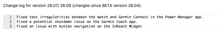 Annars är ändringsloggen för Fenix 7 betaversion 26.09-utgåvan nästan identisk. Den listar tre buggfixar, varav en tar itu med ett problem med Power Manager-appen där texten på klockan inte matchade den som visas i Garmin Connect-appen. Ett problem som kunde få dessa smartklockor att stängas av när du använder Garmin Coach-appen har lösts, liksom fasta textavvikelser mellan klockan och Garmin Connect i Power Manager-appen. Dessutom uppges en bugg kopplad till knappnavigering för InReach Widget vara åtgärdad.